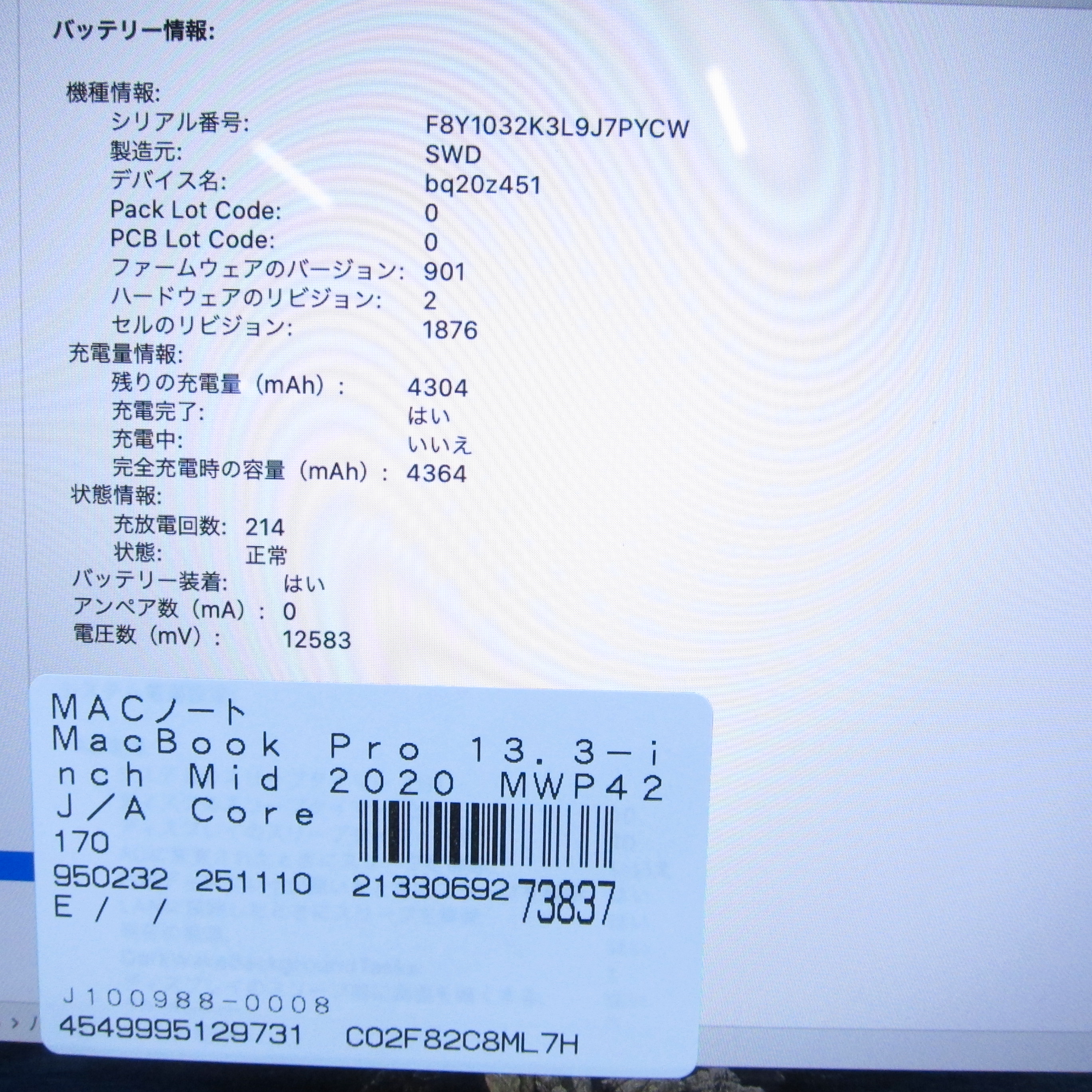〔中古品〕 MacBook Pro 13.3-inch Mid-2020 MWP42J/A Core_i5 2.0GHz 16GB SSD512GB スペースグレイ 〔10.15 Catalina〕 [グラフィック:Intel Iris Plus Graphics/JISキーボード]