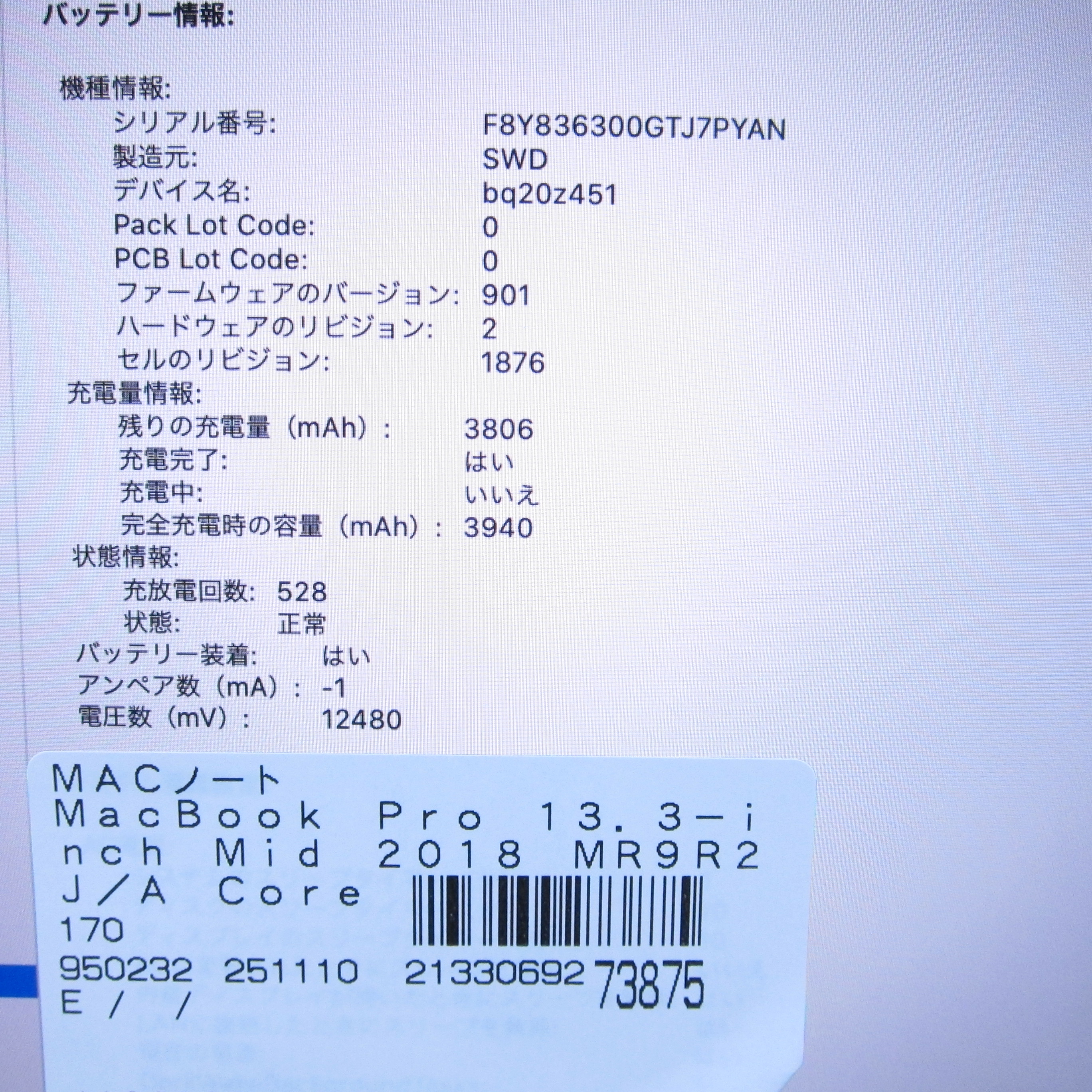 〔中古品〕 MacBook Pro 13.3-inch Mid-2018 MR9R2J/A Core_i7 2.7GHz 16GB SSD512GB スペースグレイ 〔10.15 Catalina〕 [グラフィック:Intel Iris Plus Graphics 655(CPU内蔵)/JISキーボード]