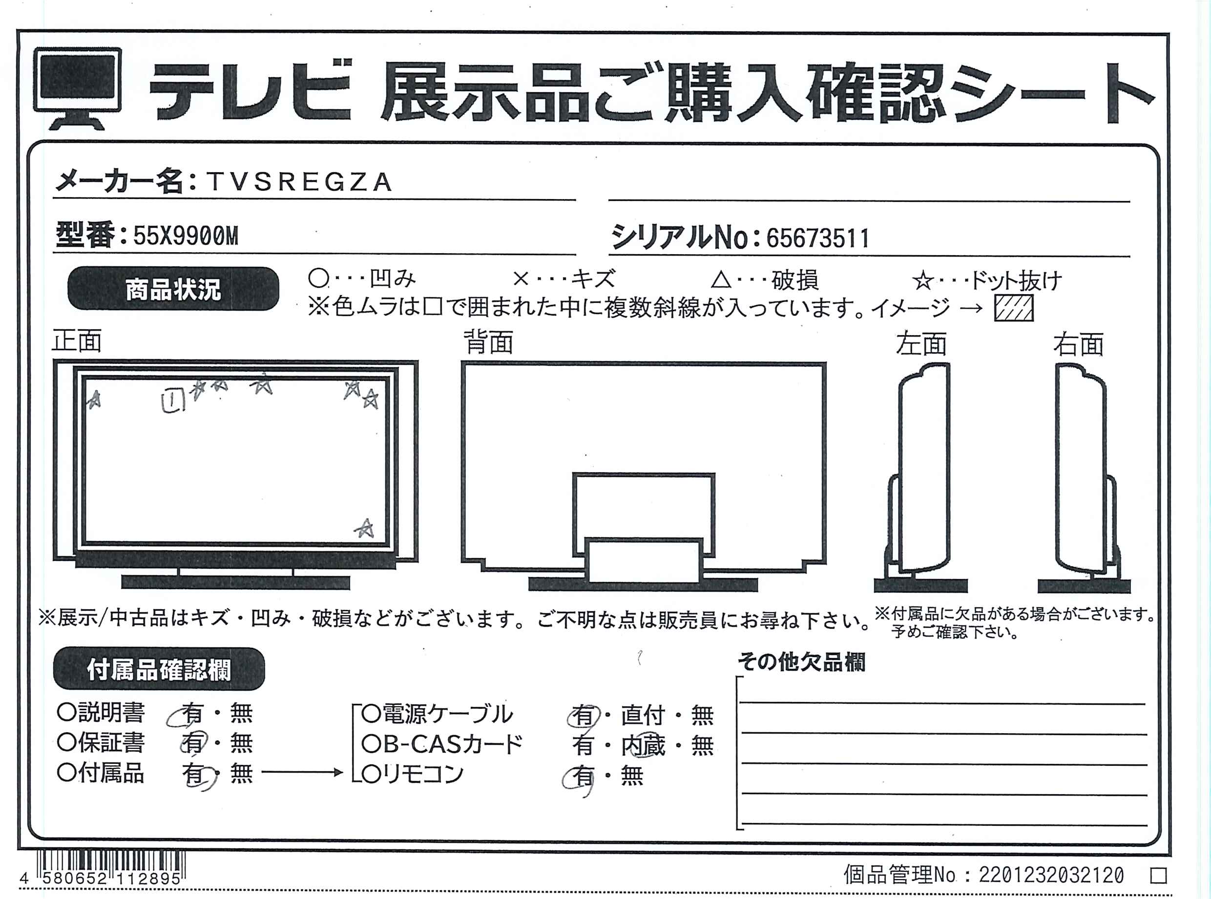 中古商品ランクについて 付属品・商品状態について 〔付属品〕取扱説明書、スタンド一式、リモコン、リモコン用乾電池×2、電源コード、転倒防止バンド、ネジ(短)、ネジ(長)、背面カバー