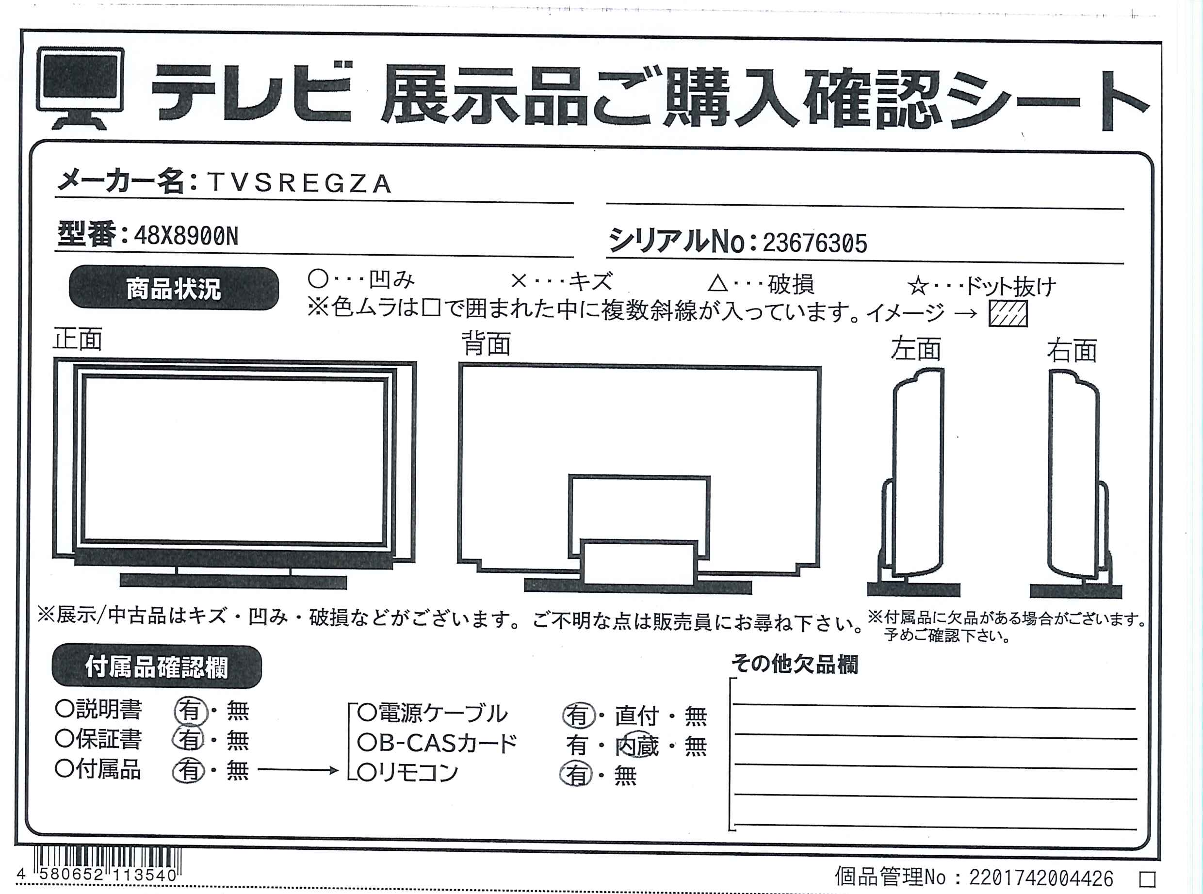 中古商品ランクについて 付属品・商品状態について 〔付属品〕取扱説明書、スタンド一式、リモコン(CT-90505)、単四形乾電池×2、電源コード、ネジ(長)、ネジ(短)、転倒防止バンド、コードクランプ、背面カバー
