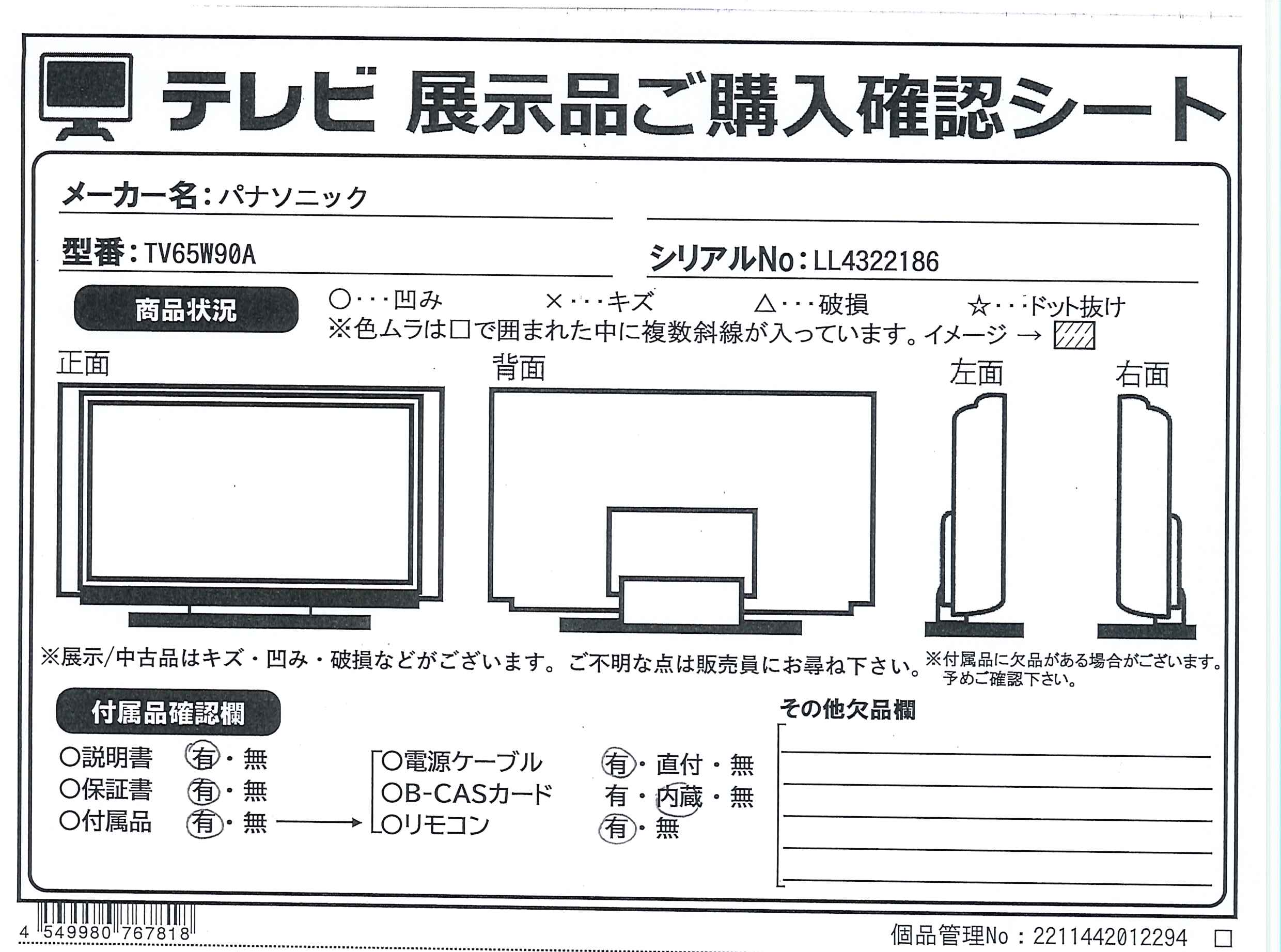 中古商品ランクについて 付属品・商品状態について 〔付属品〕説明書、リモコン、リモコン用乾電池×2、電源コード、転倒防止スタンド、本体固定用ねじ×4、クランパー×2、ベルト、ねじ(ベルト用)黒、木ねじ 黒、金具×2、スタートガイド