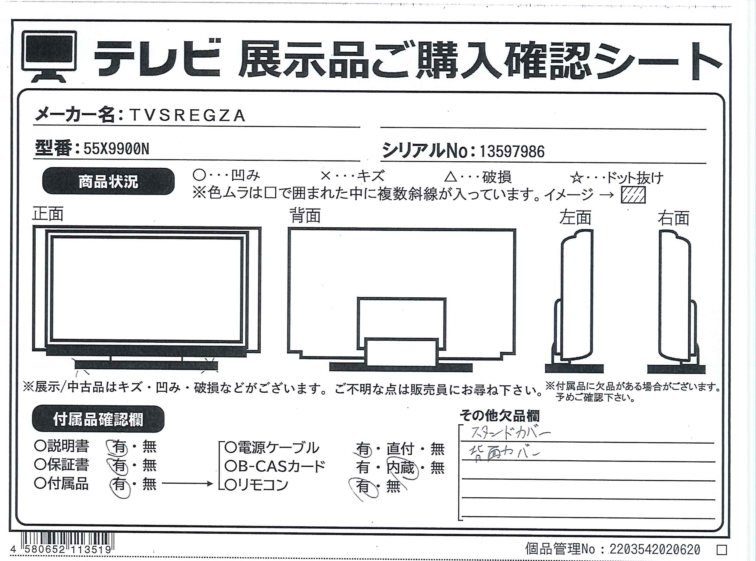 中古商品ランクについて 付属品・商品状態について 〔付属品〕取扱説明書、リモコン、リモコン用乾電池×2、スタンド一式、電源コード、転倒防止バンド一式、コードクランプ