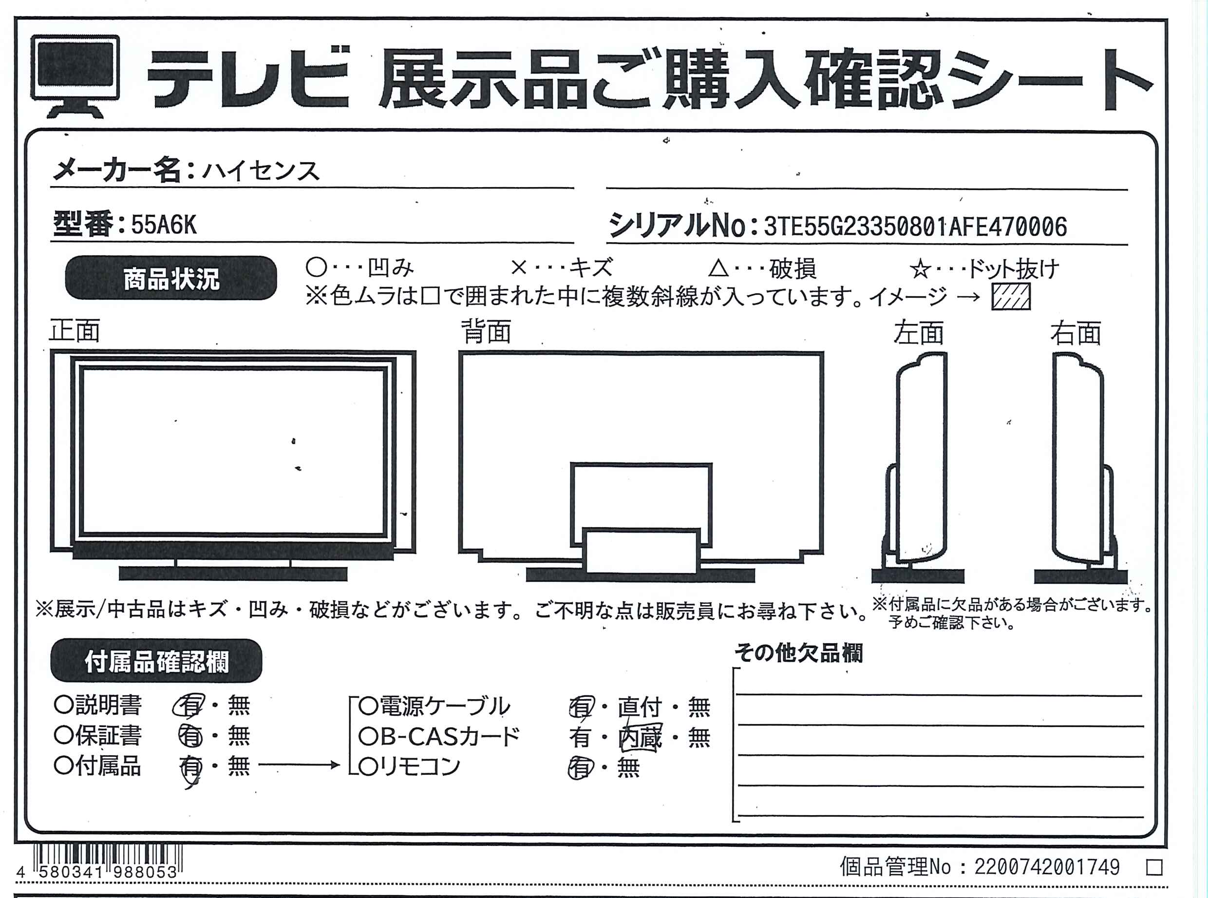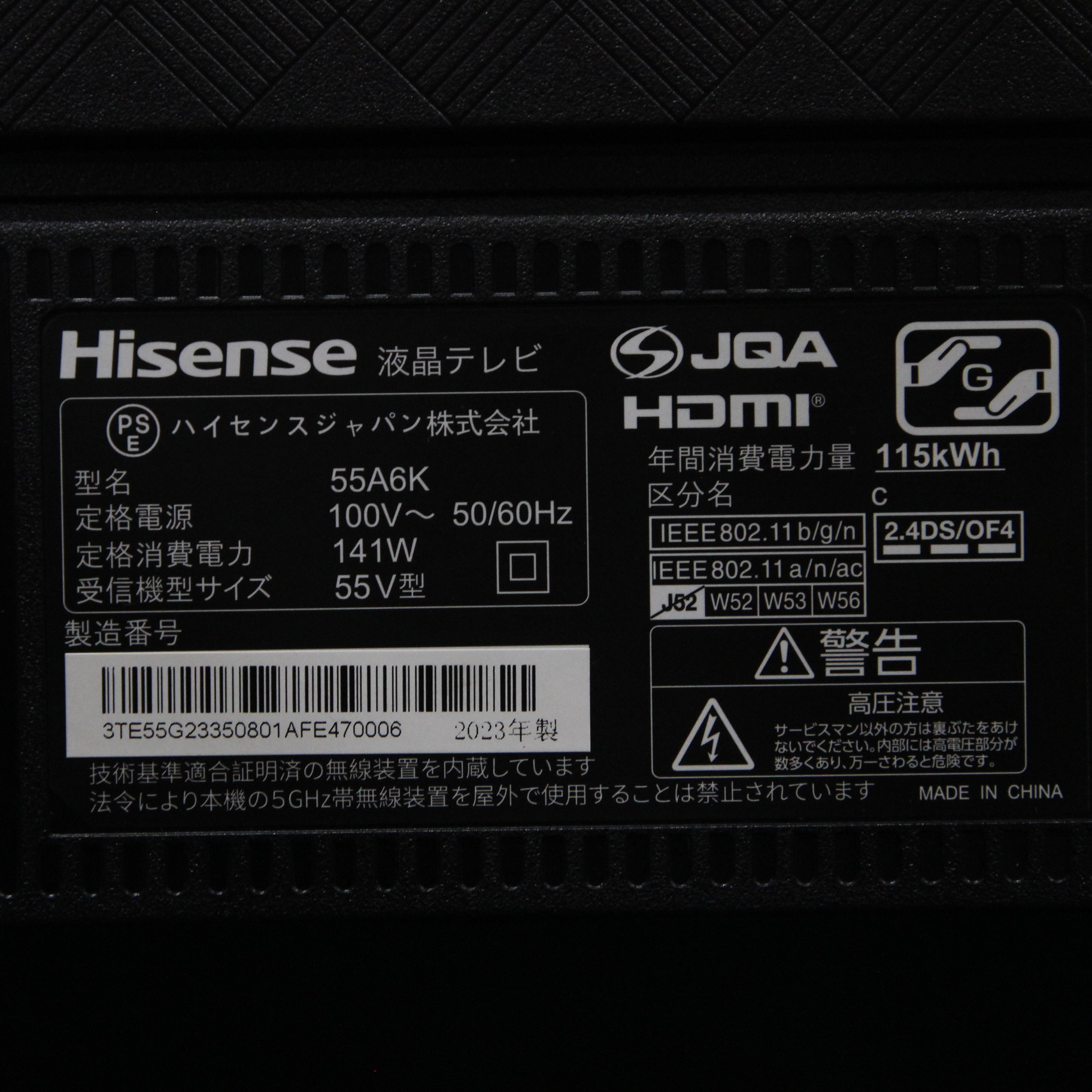 〔展示品〕 液晶テレビ 55A6K [55V型 /Bluetooth対応 /4K対応 /BS・CS 4Kチューナー内蔵 /YouTube対応]