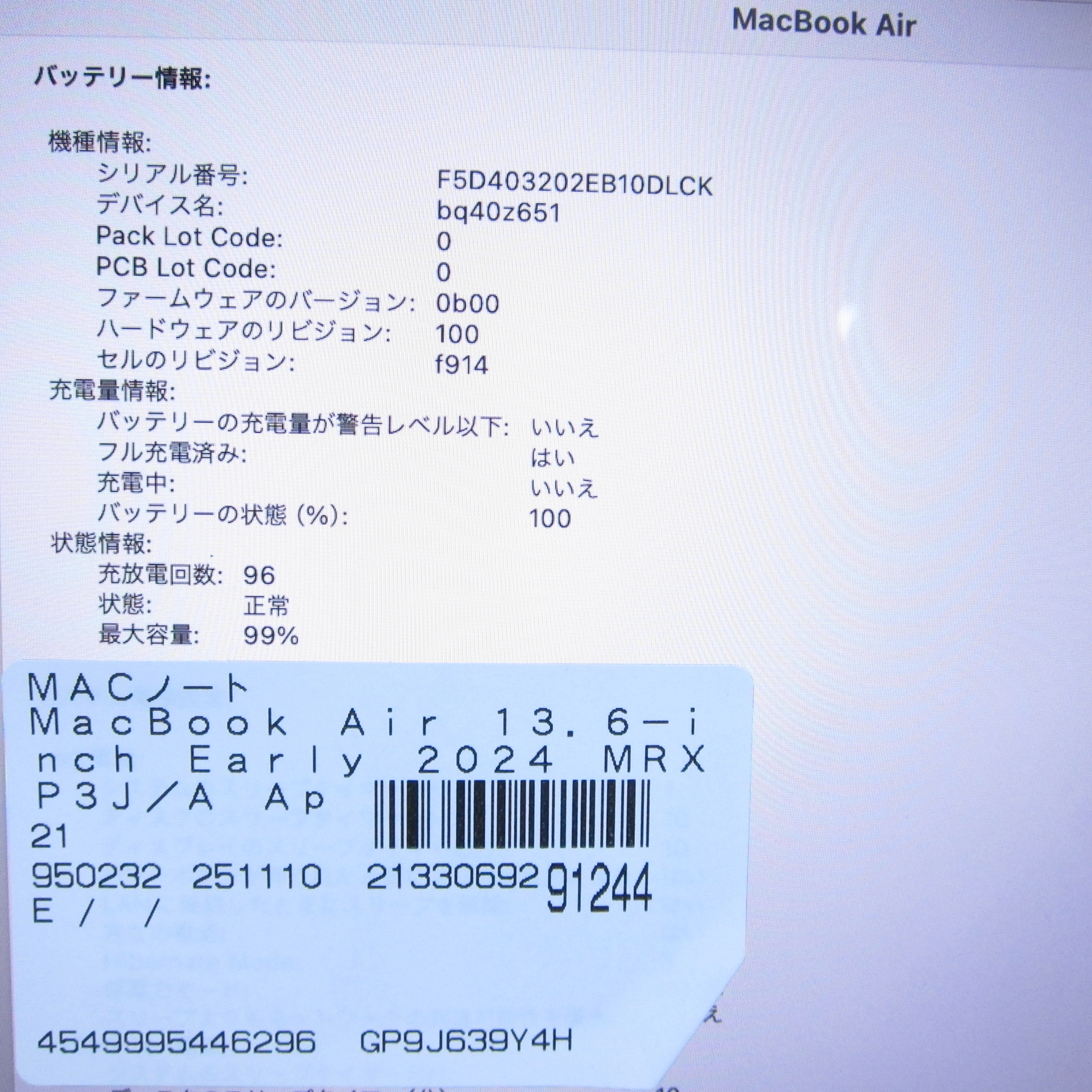 商品名 〔中古品〕 MacBook Air 13.6-inch Early-2024 MRXP3J/A Apple M3 8コアCPU_10コアGPU 8GB SSD512GB スペースグレイ 〔14.7 Sonoma〕 [グラフィック:オンボード/JISキーボード]
