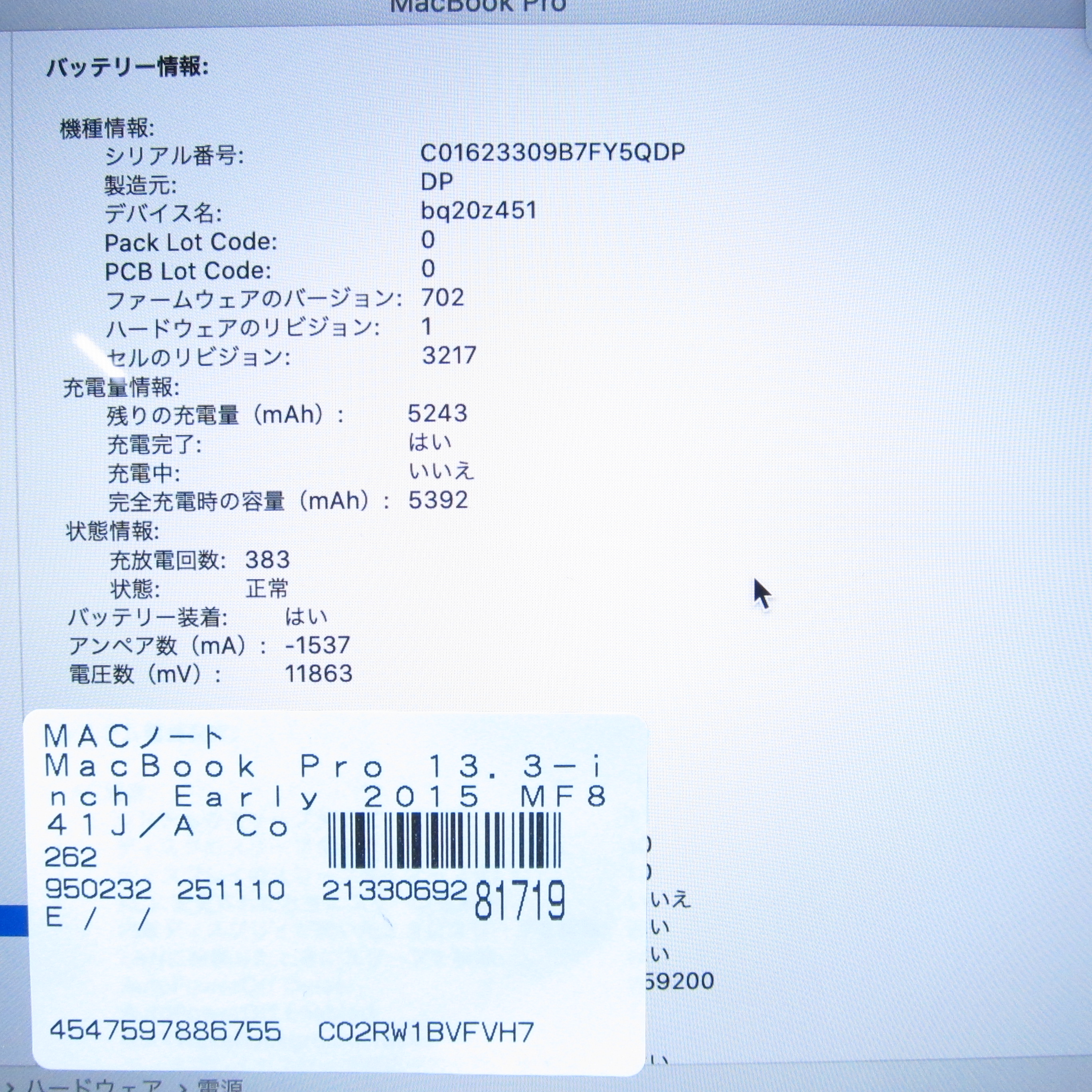 【CPU】Core i5(2.9GHz)、【メモリ】8GB、【SSD】512GB、【ドライブ】無し、【モニター】13.3インチ、【グラフィック】Intel Iris Graphics 6100、【OS】OS X