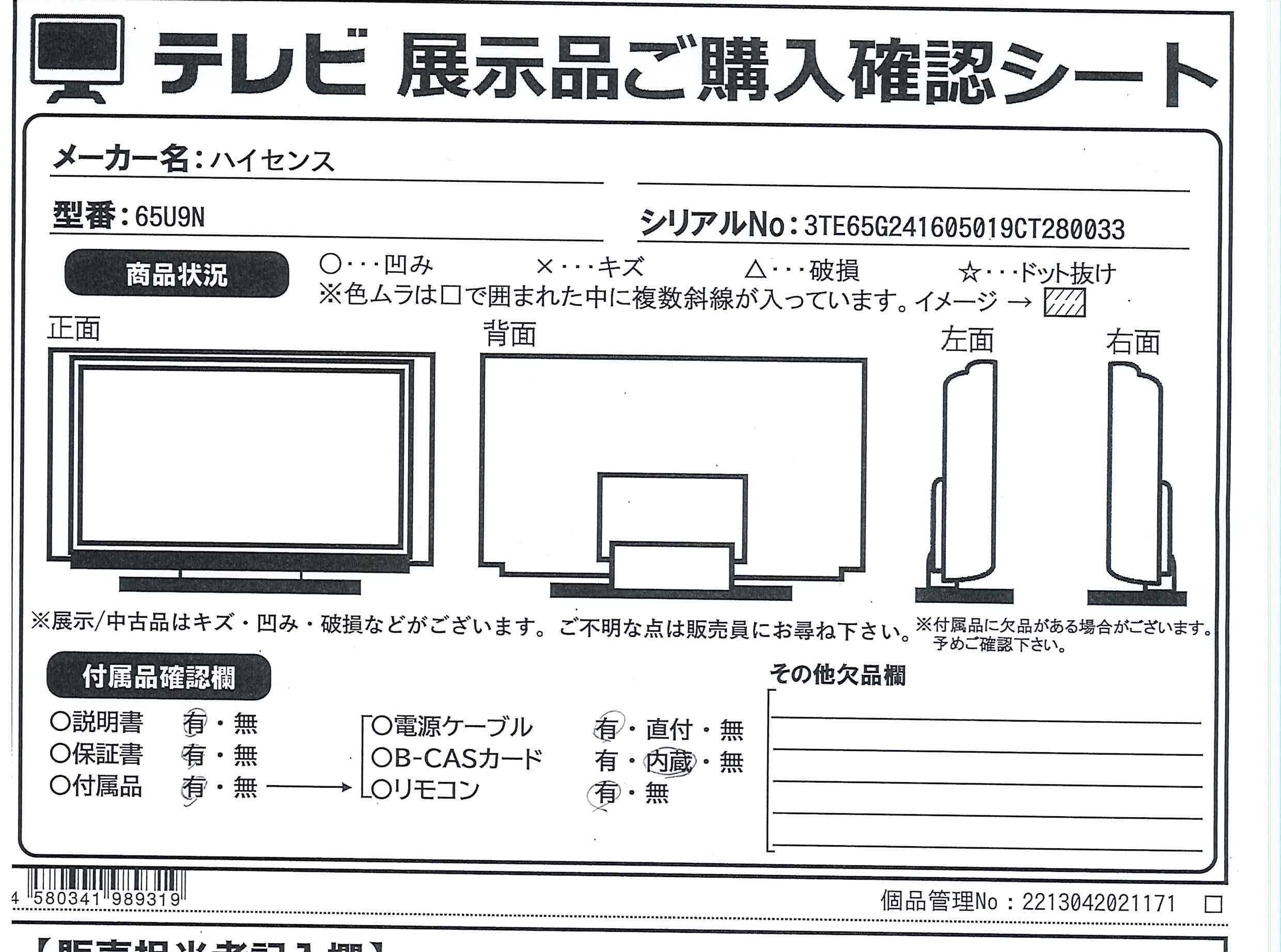 中古商品ランクについて 付属品・商品状態について 〔付属品〕説明書、電源コード、単三型乾電池×2、リモコン、転倒防止ベルト一式、スタンド一式
