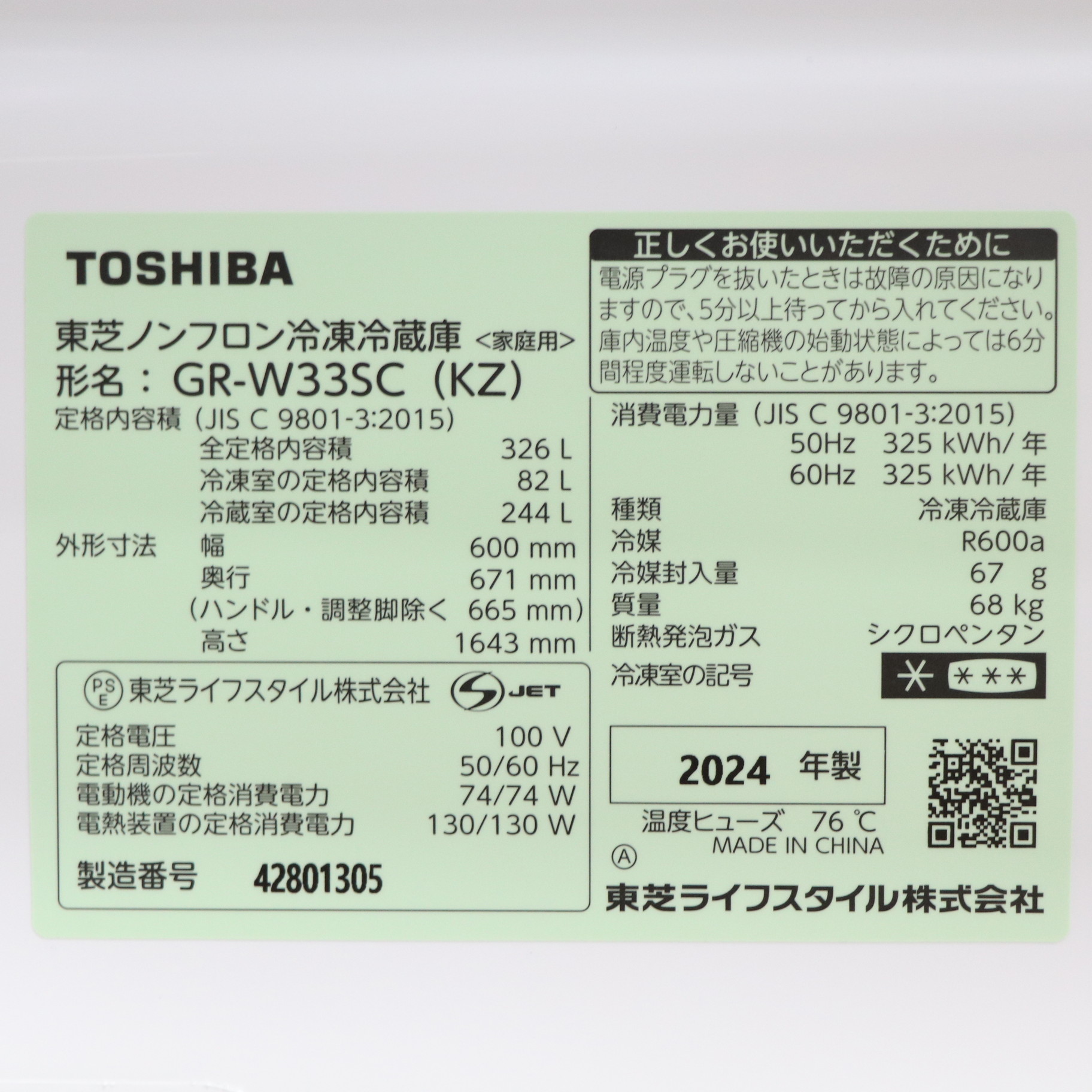 〔展示品〕 冷蔵庫 VEGETA(ベジータ)SCシリーズ マットチャコール GR-W33SC-KZ [幅60cm /326L /3ドア /右開きタイプ /2024年]