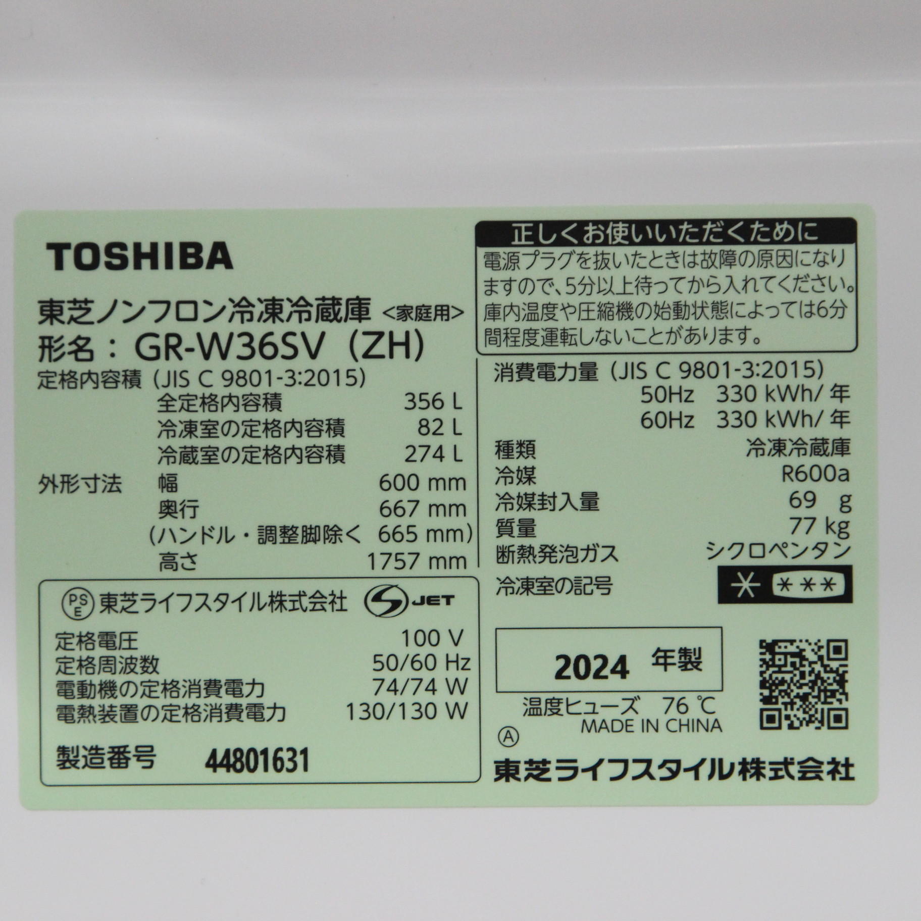 〔展示品〕 冷蔵庫 VEGETA(ベジータ)SV アッシュグレージュ GR-W36SV-ZH [幅60cm /356L /3ドア /右開きタイプ /2024年]