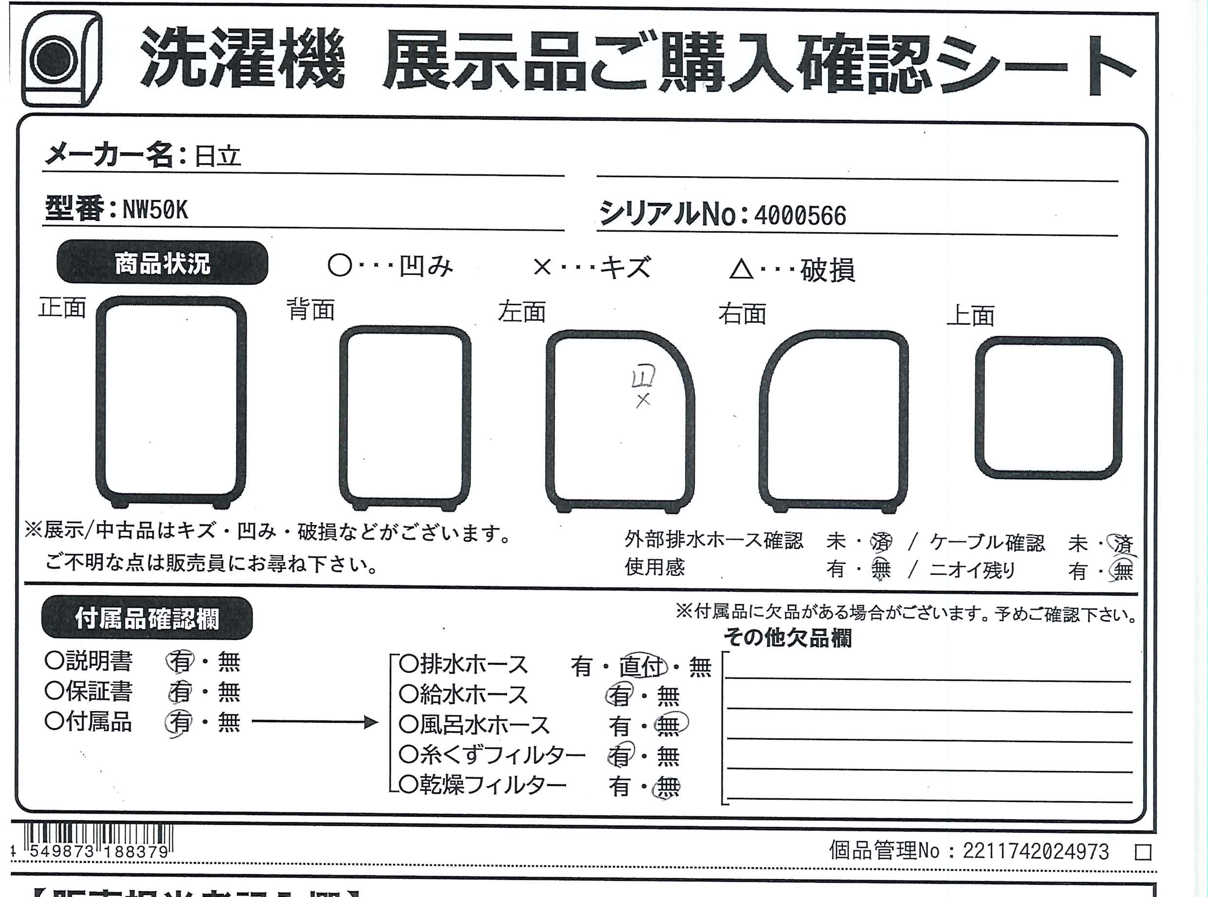 中古商品ランクについて 付属品・商品状態について 〔付属品〕説明書、給水ホース、水準器、保護カバー、据付説明書