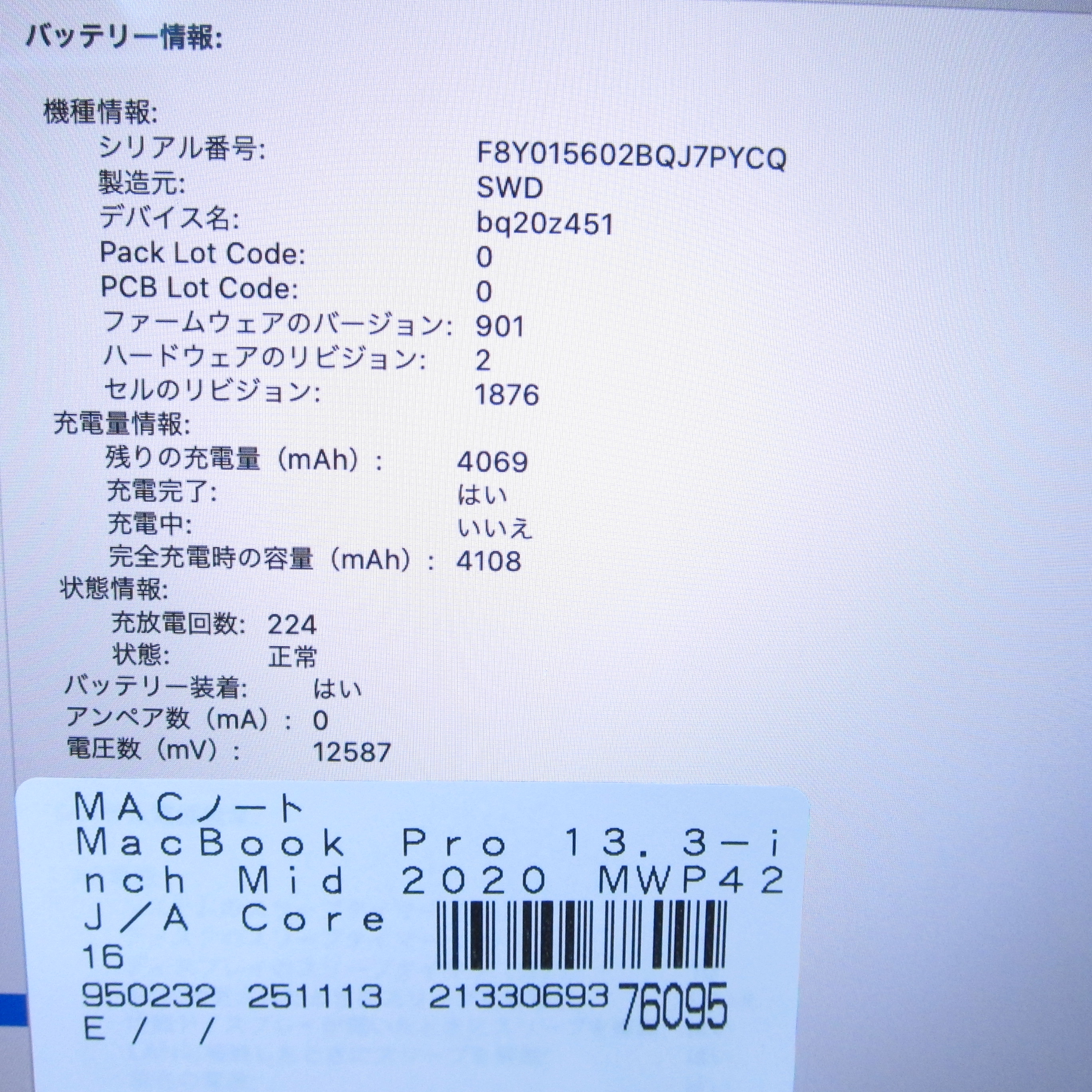 〔中古品(難あり)〕 MacBook Pro 13.3-inch Mid-2020 MWP42J/A Core_i5 2.0GHz 16GB SSD512GB スペースグレイ 〔10.15 Catalina〕 [グラフィック:Intel Iris Plus Graphics/JISキーボード]