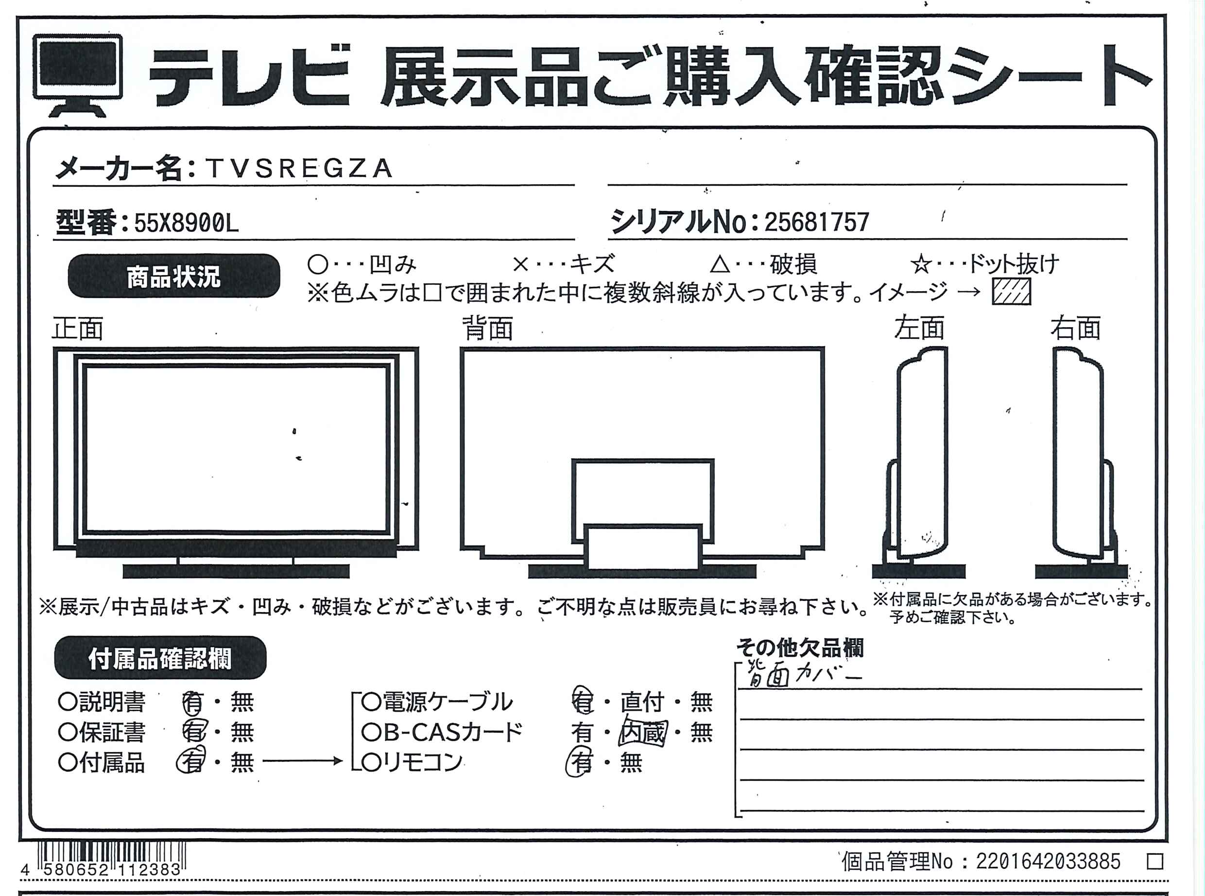 〔付属品〕取扱説明書、レグザメンバーズ登録チラシ、スタンド一式、リモコン(CT-90499)、リモコン用単4型乾電池×2、電源コード、転倒防止バンド一式、スタンドカバー
