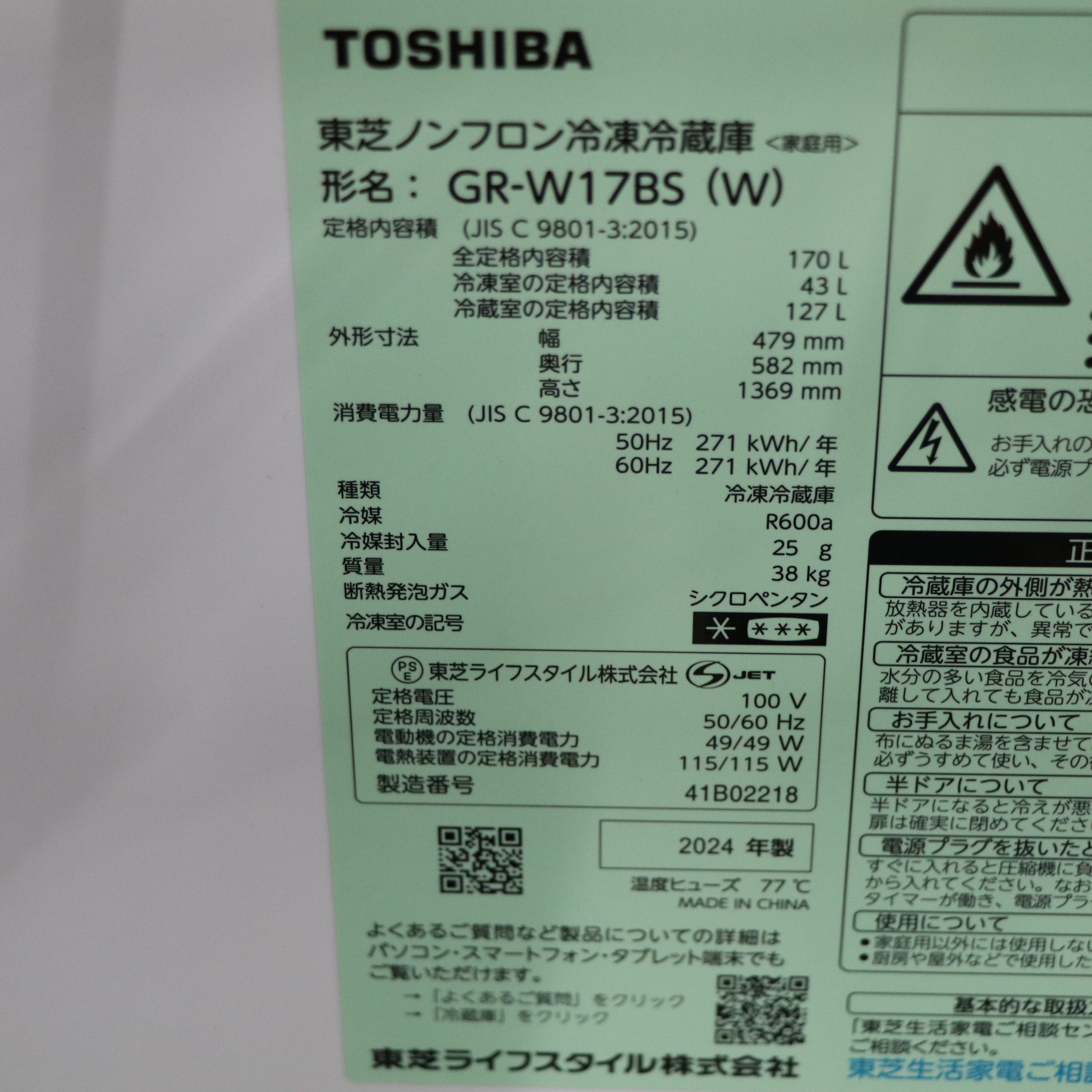 〔展示品〕 冷蔵庫 BSシリーズ セミマットホワイト GR-W17BS-W [幅47.9cm /170L /2ドア /右開きタイプ /2024年]
