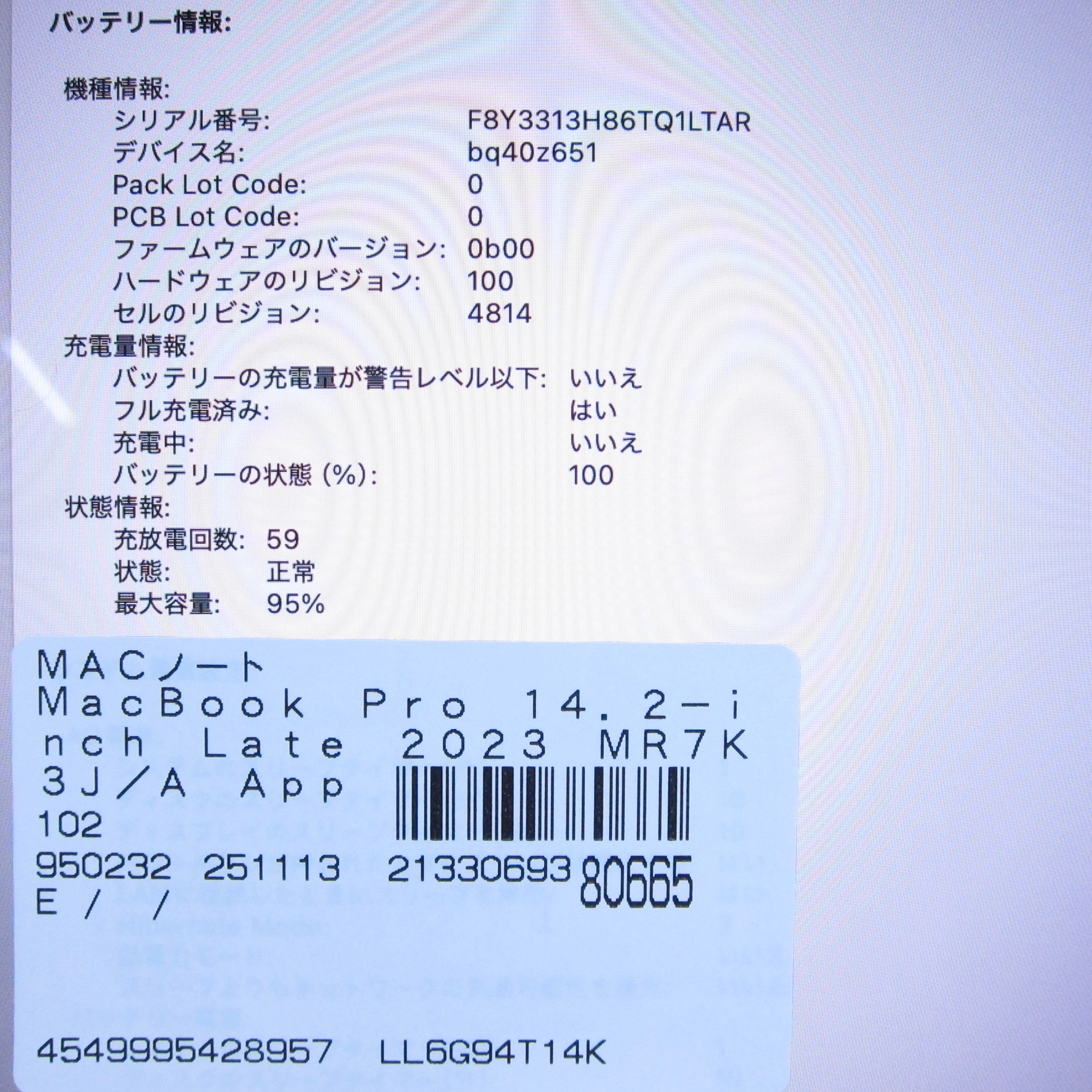 このMacBook Proは、MagSafe充電ポート、2つのThunderbolt / USB 4ポート、SDXCカードスロット、HDMIポート、ヘッドフォンジャックを搭載しています。Wi-Fi 6E※4とBluetooth 5.3による高速ワイヤレス接続に対応。外部ディスプレイを1台接続することもできます。