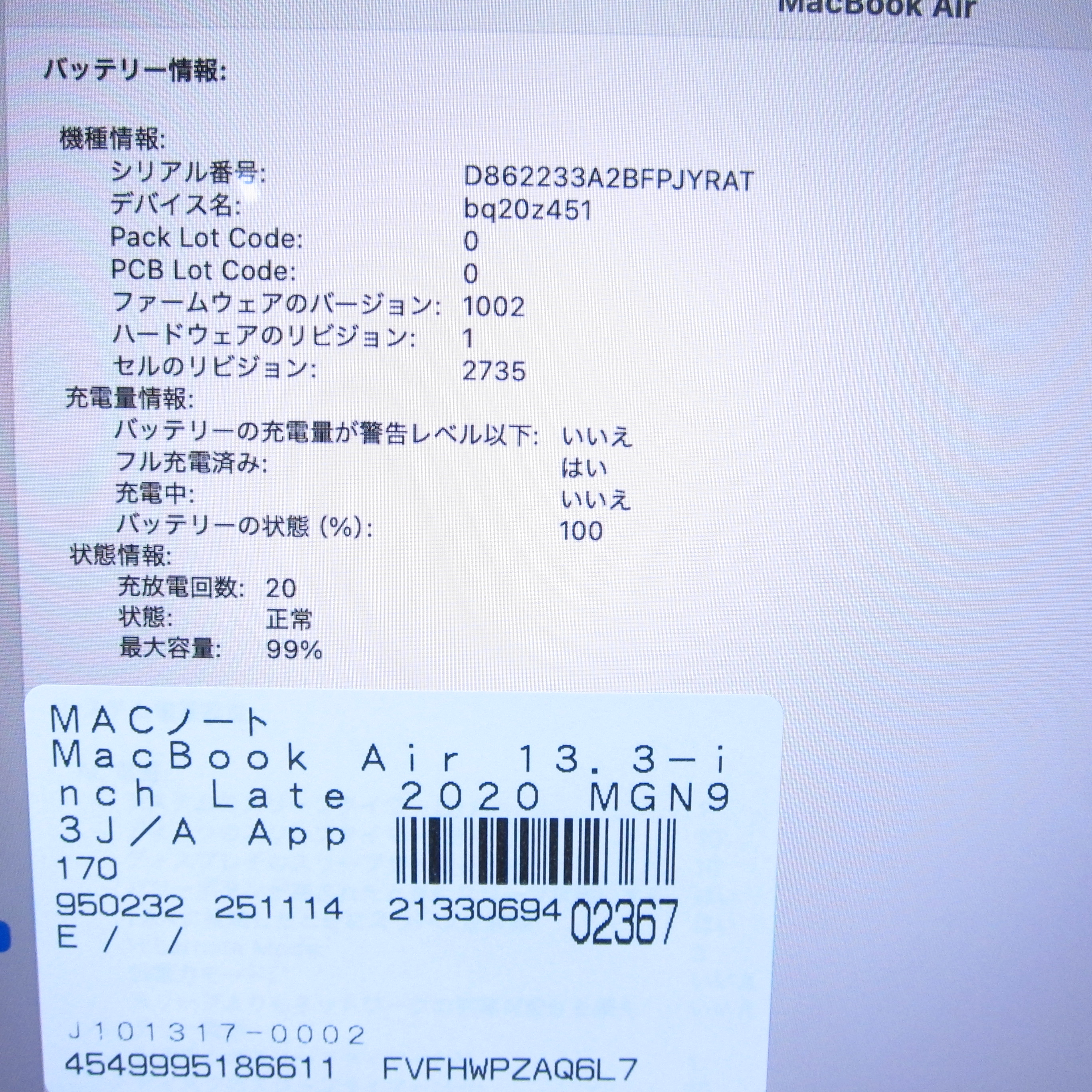 〔中古品〕 MacBook Air 13.3-inch Late-2020 MGN93J/A Apple M1 8コアCPU_7コアGPU 8GB SSD256GB シルバー 〔15.7 Sequoia〕 [グラフィック:オンボード/JISキーボード]