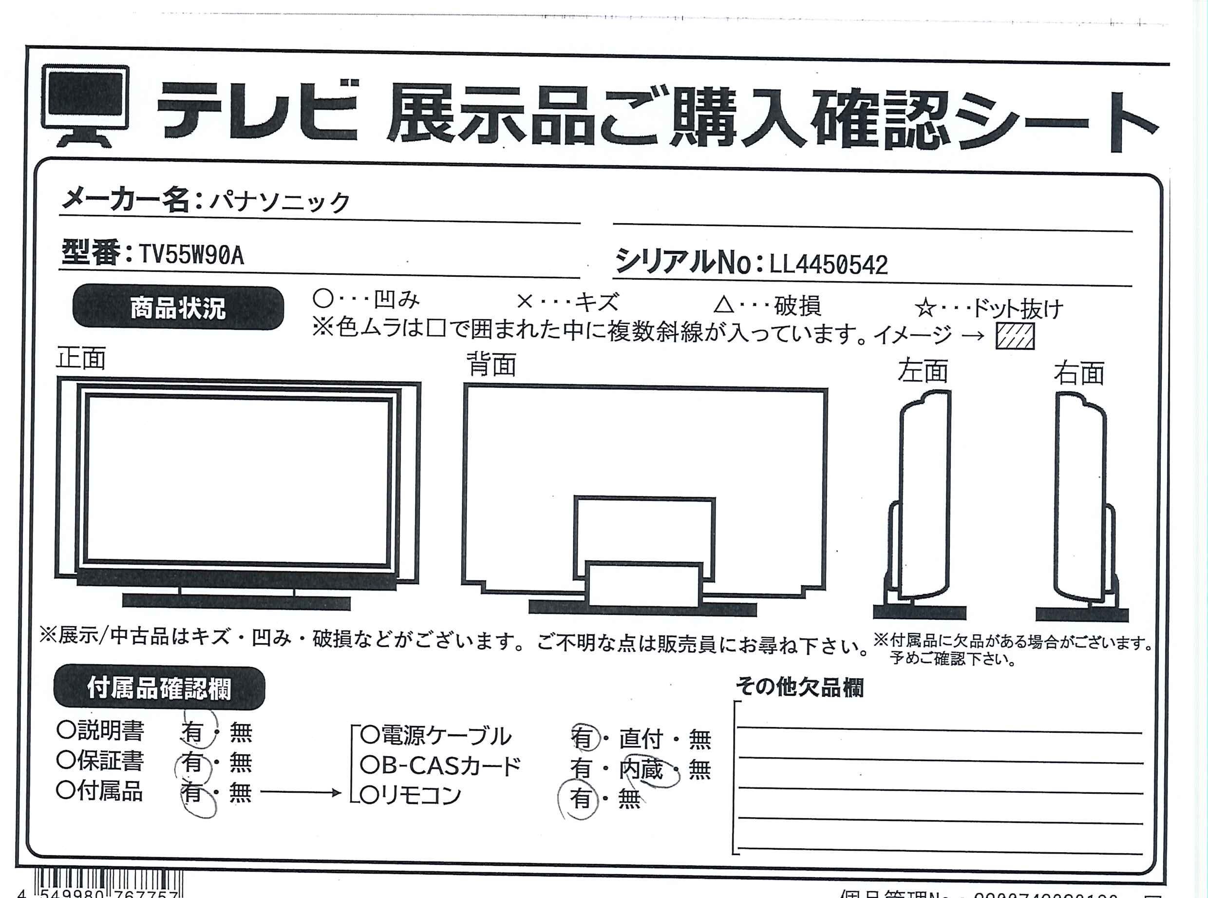中古商品ランクについて 付属品・商品状態について 〔付属品〕説明書、スタートガイド、リモコン、リモコン用乾電池×2、電源コード、スタンド一式、クランパー×2、転倒・落下防止部品一式