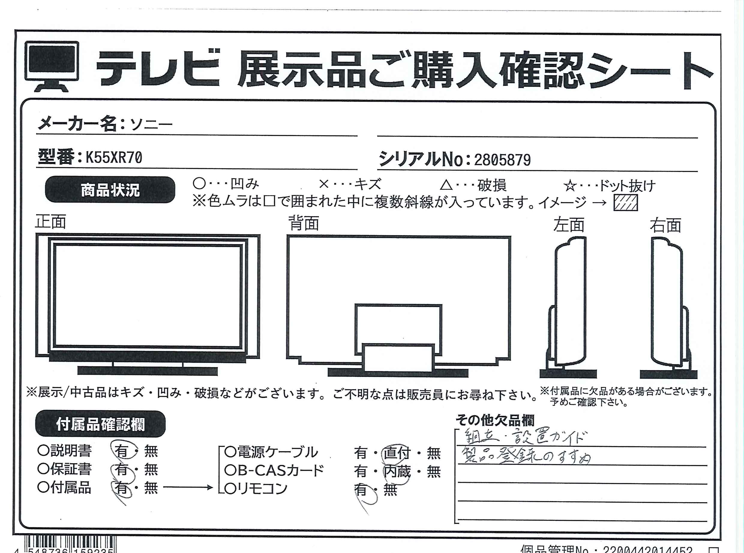 中古商品ランクについて 付属品・商品状態について 〔付属品〕取扱説明書、リモコン、リモコン用単4形乾電池×2、スタンド左右一式(SB)、スペーサー(VS)、転倒防止ベルト一式(FB)、光ミニプラグ変換アダプター