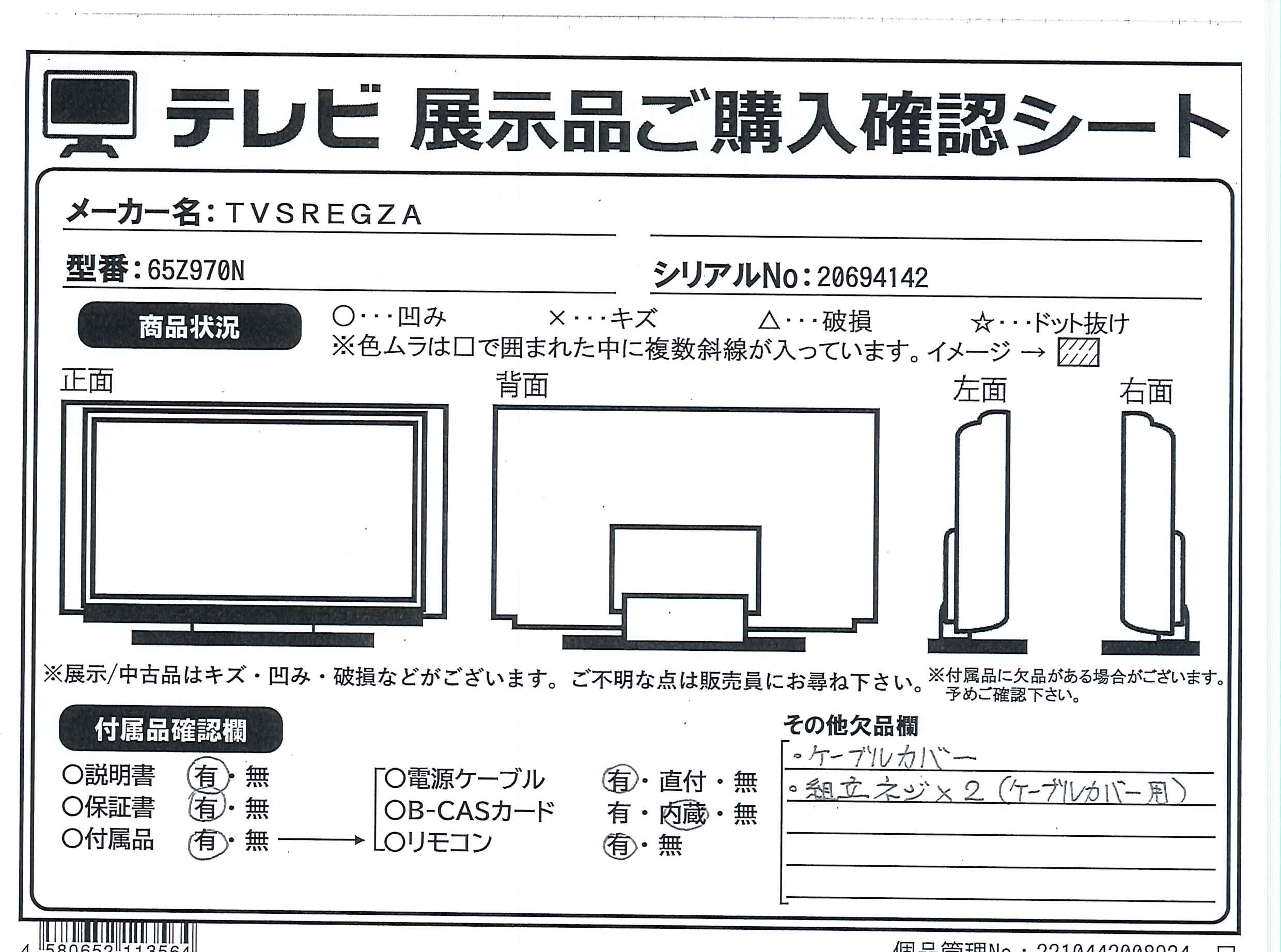 中古商品ランクについて 付属品・商品状態について 〔付属品〕説明書、スタンド一式、転倒防止バンド一式、リモコン、単四型乾電池×2、電源コード、スタンドカバー