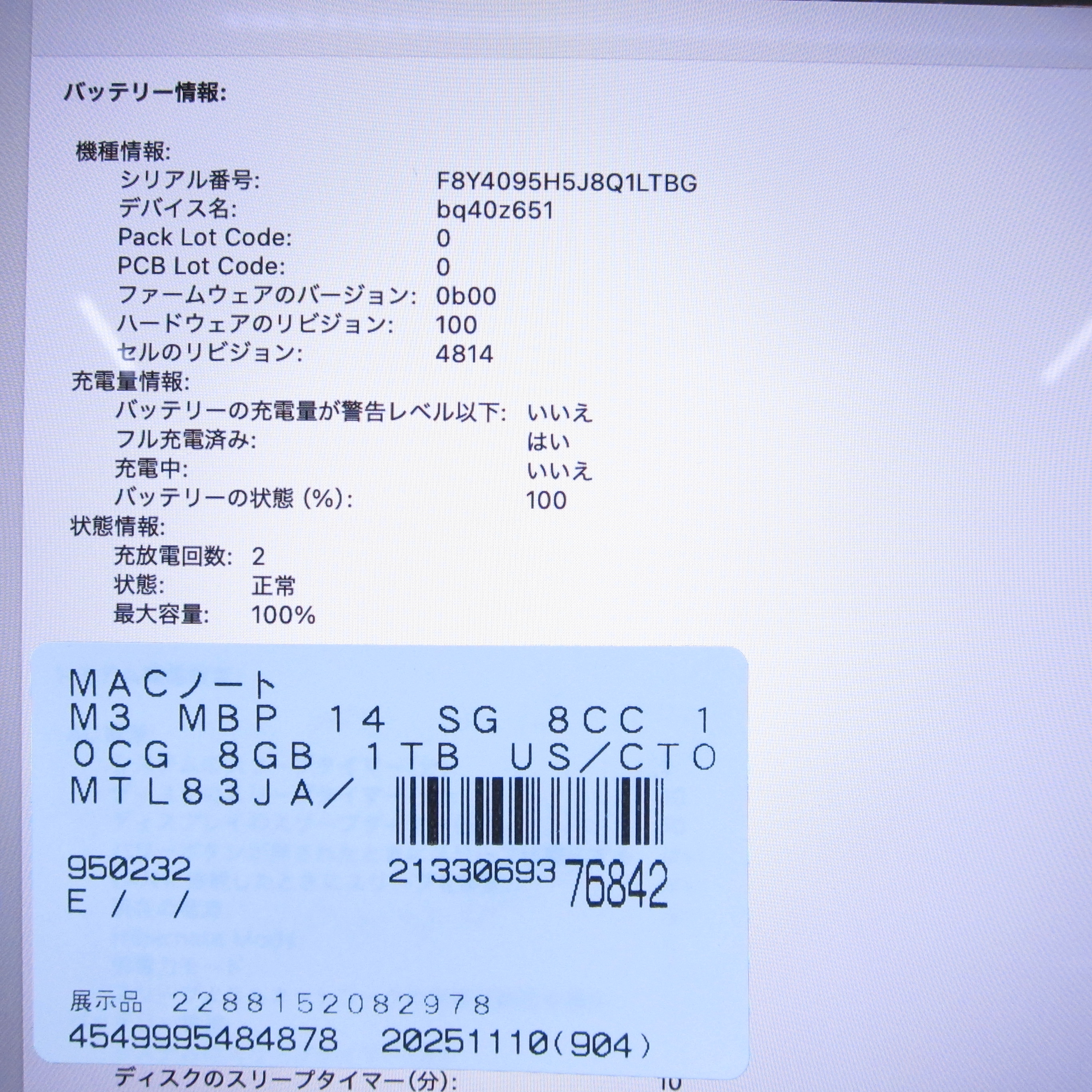 商品名 〔展示品〕 MacBook Pro 14.2-inch Late-2023 MTL83J/A Apple M3 8コアCPU_10コアGPU 8GB SSD1TB スペースグレイ 〔15.5 Sequoia〕 [グラフィック:オンボード/USキーボード]