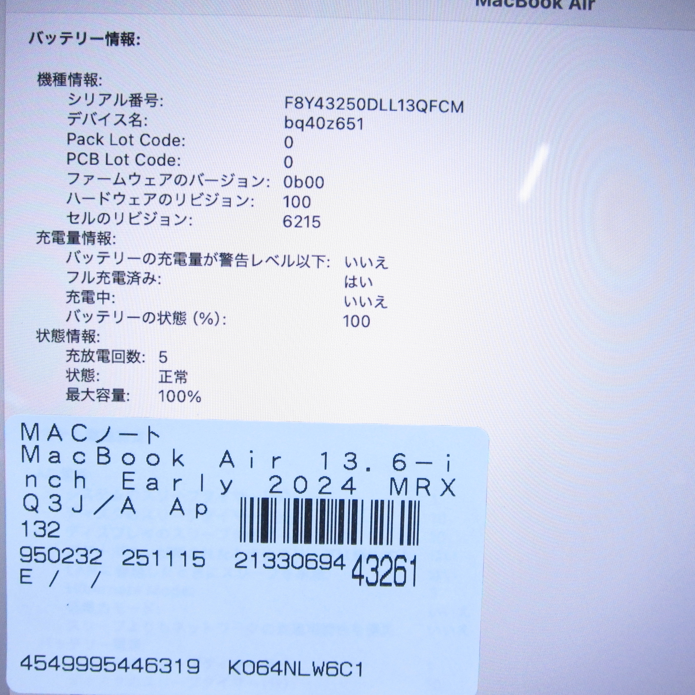 〔中古品〕 MacBook Air 13.6-inch Early-2024 MRXQ3J/A Apple M3 8コアCPU_8コアGPU 8GB SSD256GB シルバー 〔15.3 Sequoia〕 [グラフィック:オンボード/JISキーボード]