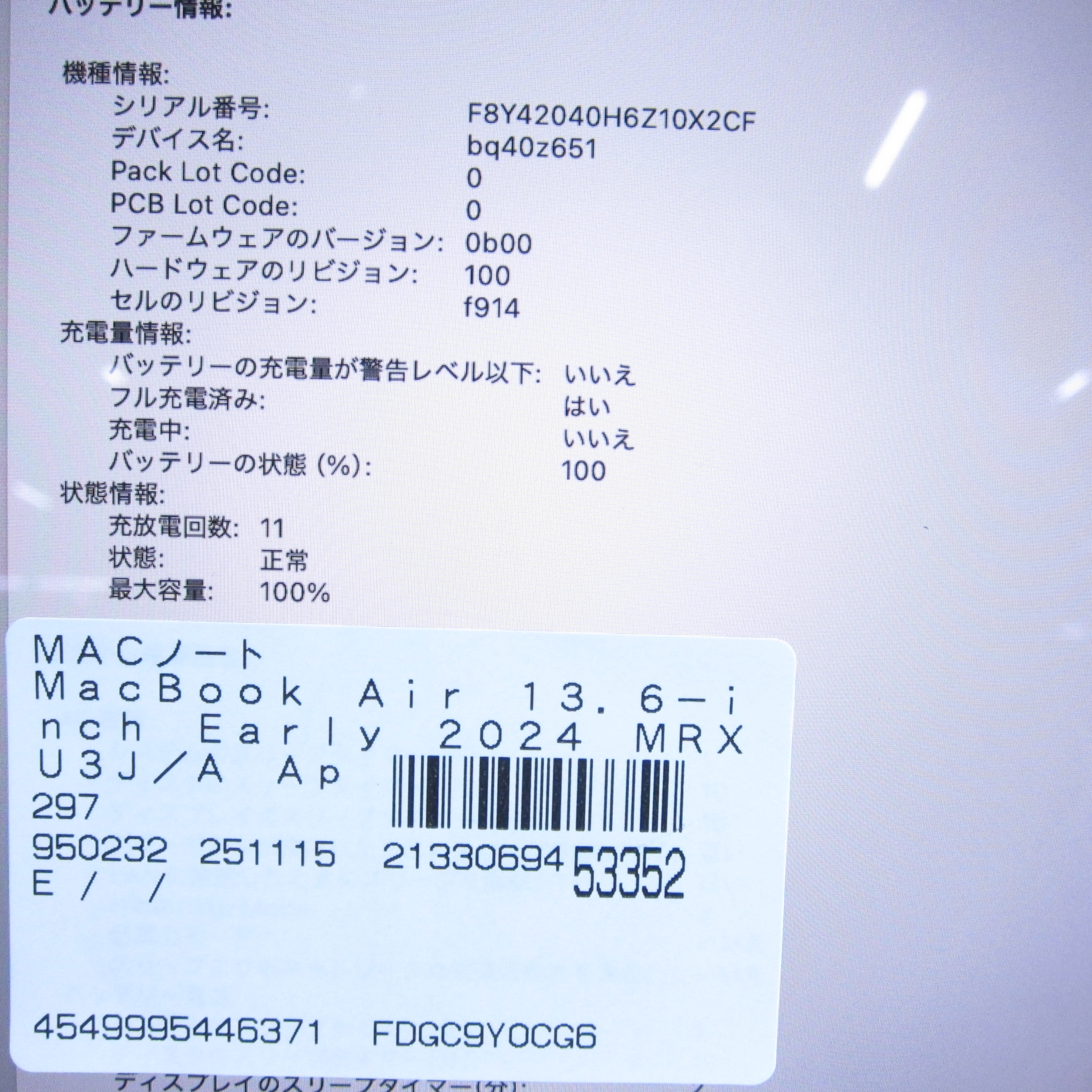 〔中古品〕 MacBook Air 13.6-inch Early-2024 MRXU3J/A Apple M3 8コアCPU_10コアGPU 8GB SSD512GB スターライト 〔15.3 Sequoia〕 [グラフィック:オンボード/JISキーボード]