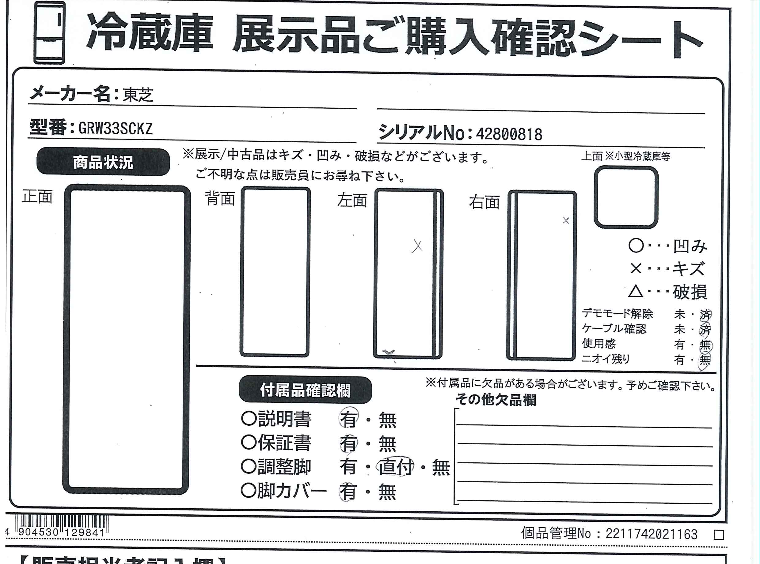 中古商品ランクについて 付属品・商品状態について 〔付属品〕説明書、調整脚×2、前面グリル、仕切れるチューブスタンド、卵スタンド、おそうじ口のフタ、給水タンク、アイスシャベル