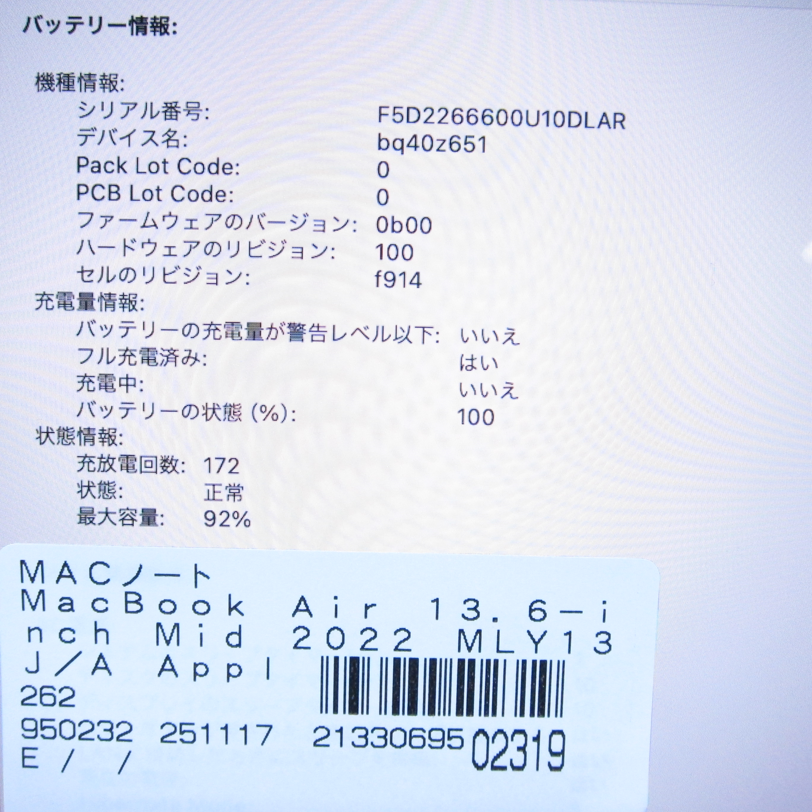 〔中古品〕 MacBook Air 13.6-inch Mid-2022 MLY13J/A Apple M2 8コアCPU_8コアGPU 8GB SSD256GB スターライト 〔14.7 Sonoma〕 [グラフィック:オンボード/USキーボード]