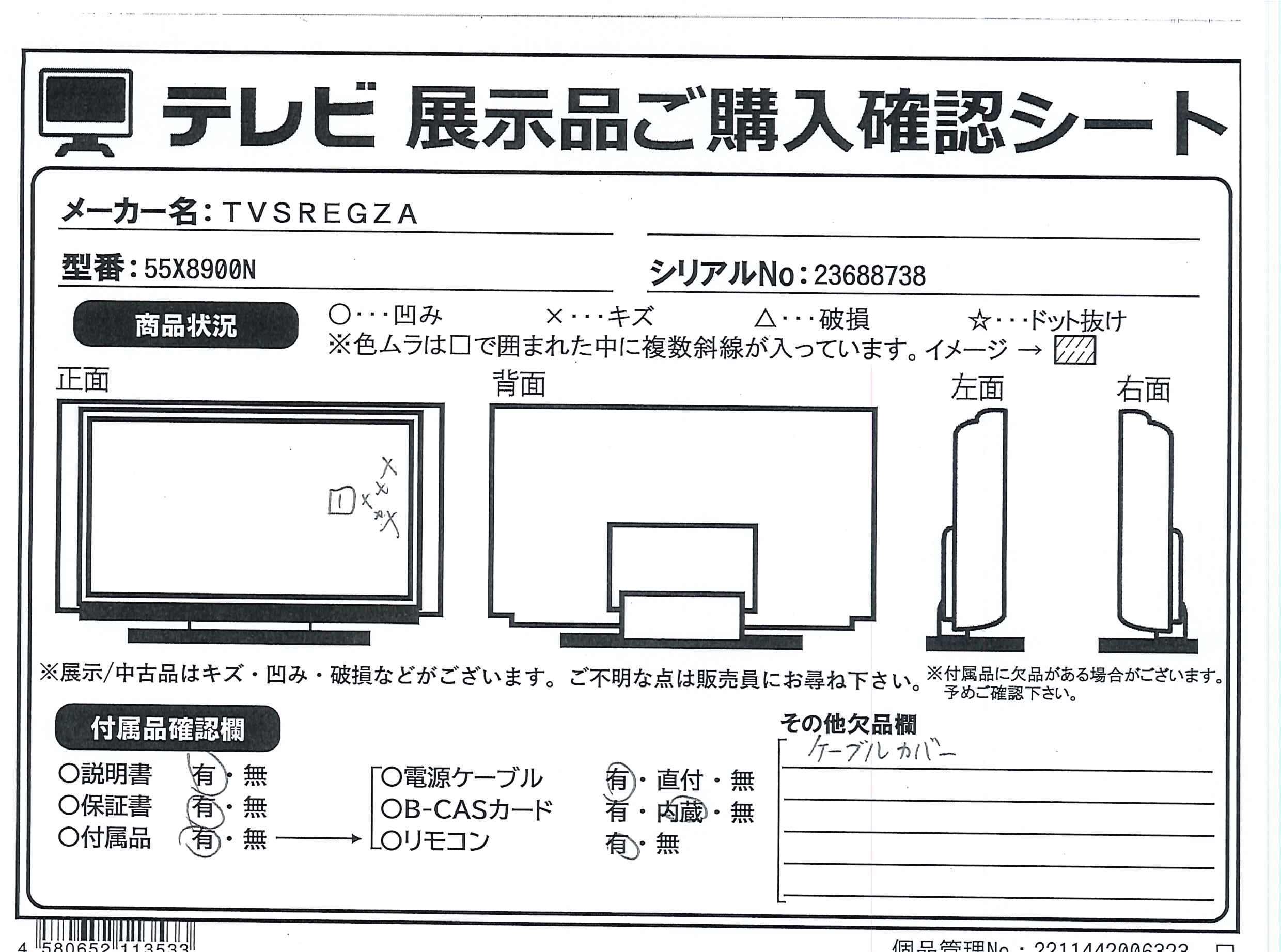 中古商品ランクについて 付属品・商品状態について 〔付属品〕説明書、スタンド一式、リモコン、単四形乾電池×2、電源コード、転倒防止バンド一式、コードクランプ、スタンドカバー、背面カバー