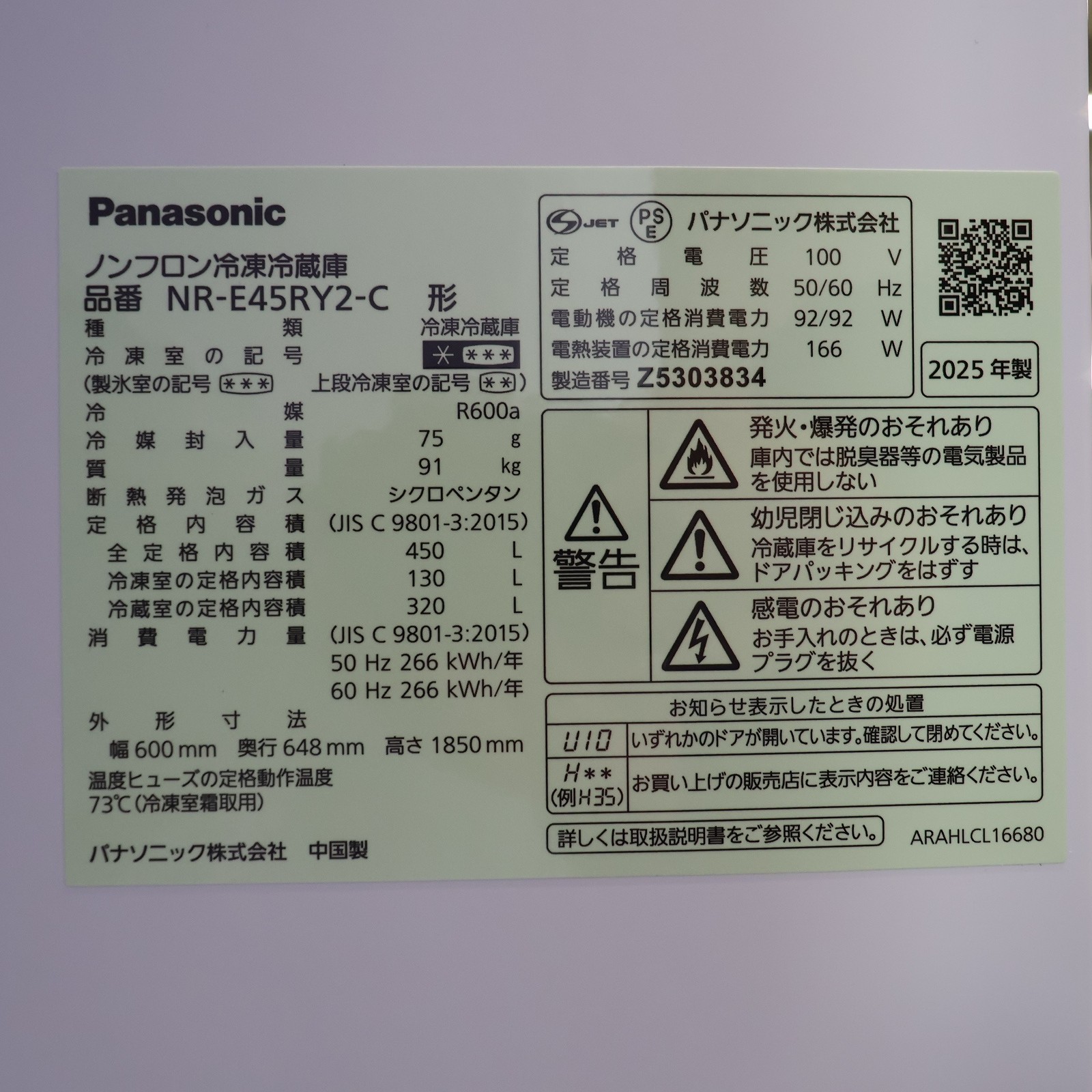 〔中古品〕 冷蔵庫 RYタイプ マットライトベージュ NR-E45RY2-C [幅60cm /450L /5ドア /右開きタイプ /2025年]