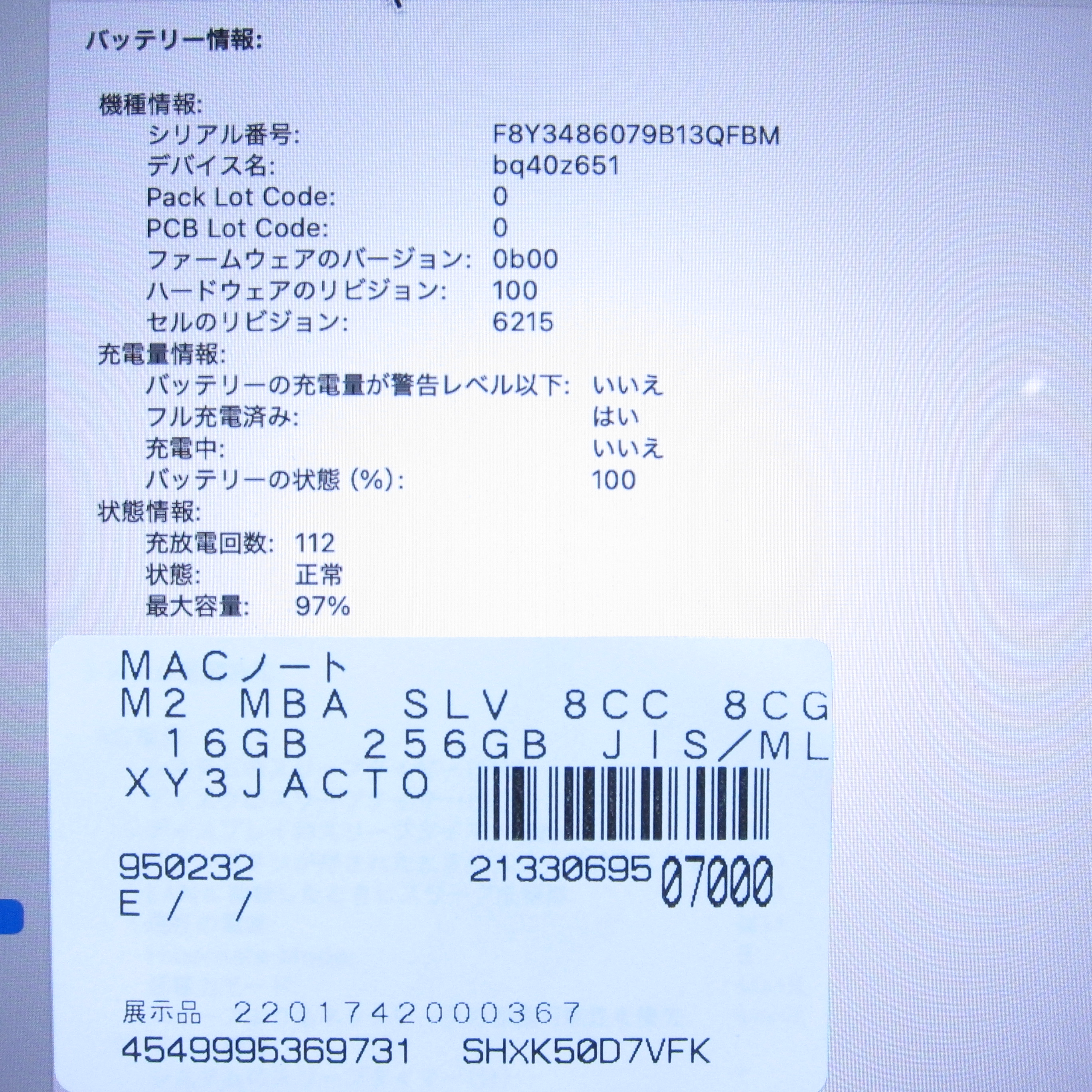 〔展示品〕 MacBook Air 13.6-inch Mid-2022 MLXY3J/A Apple M2 8コアCPU_8コアGPU 16GB SSD256GB シルバー 〔15.7 Sequoia〕 [グラフィック:オンボード/JISキーボード]