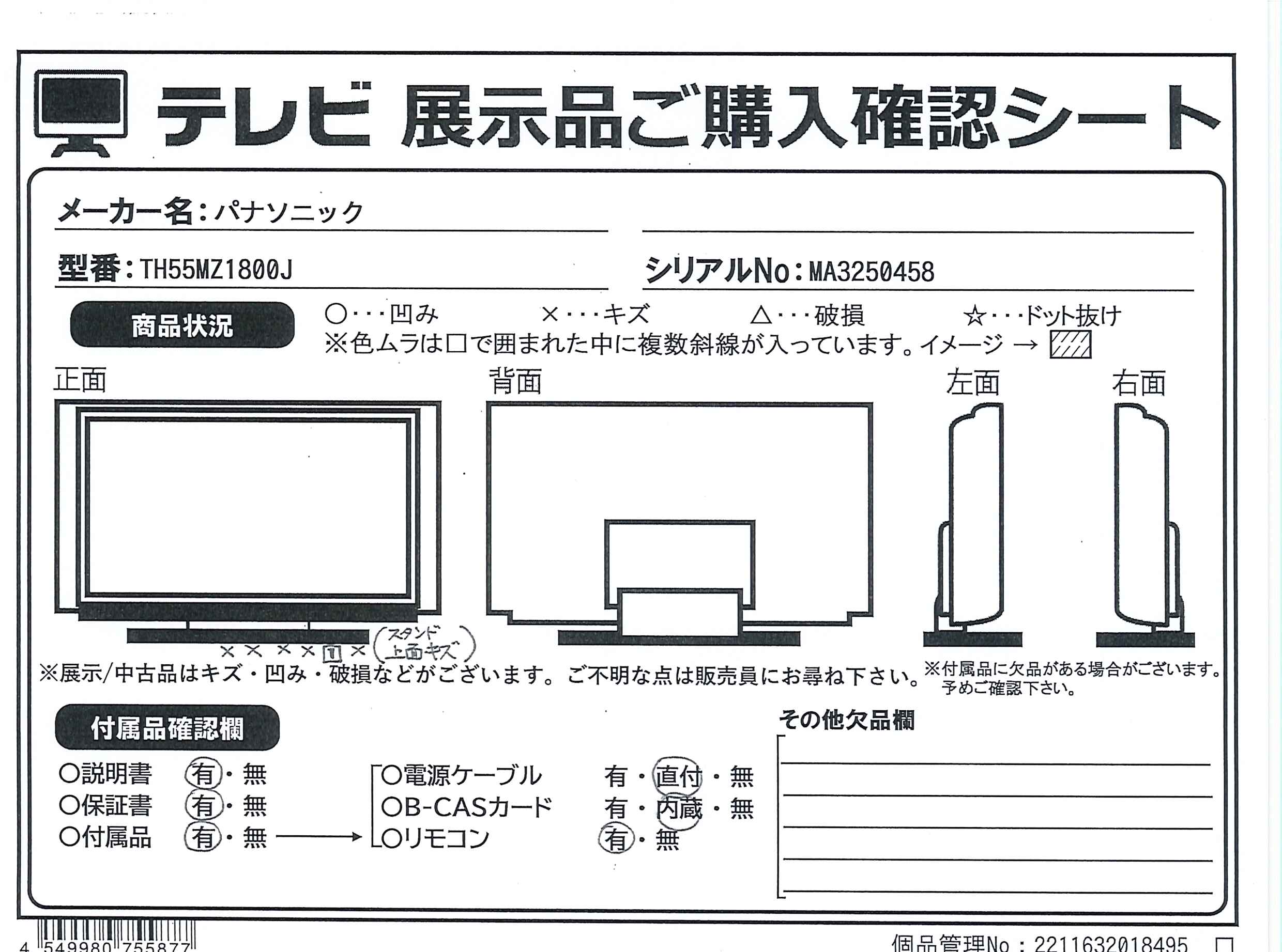 中古商品ランクについて 付属品・商品状態について 〔付属品〕取扱説明書、リモコン(品番:N2QBYA000075)、単4形乾電池×2、転倒防止スタンド、本体固定用ねじ(黒 M4×15)×4、ケーブルカバー、ベルト、ねじ(ベルト用)黒、木ねじ シルバー、金具×2