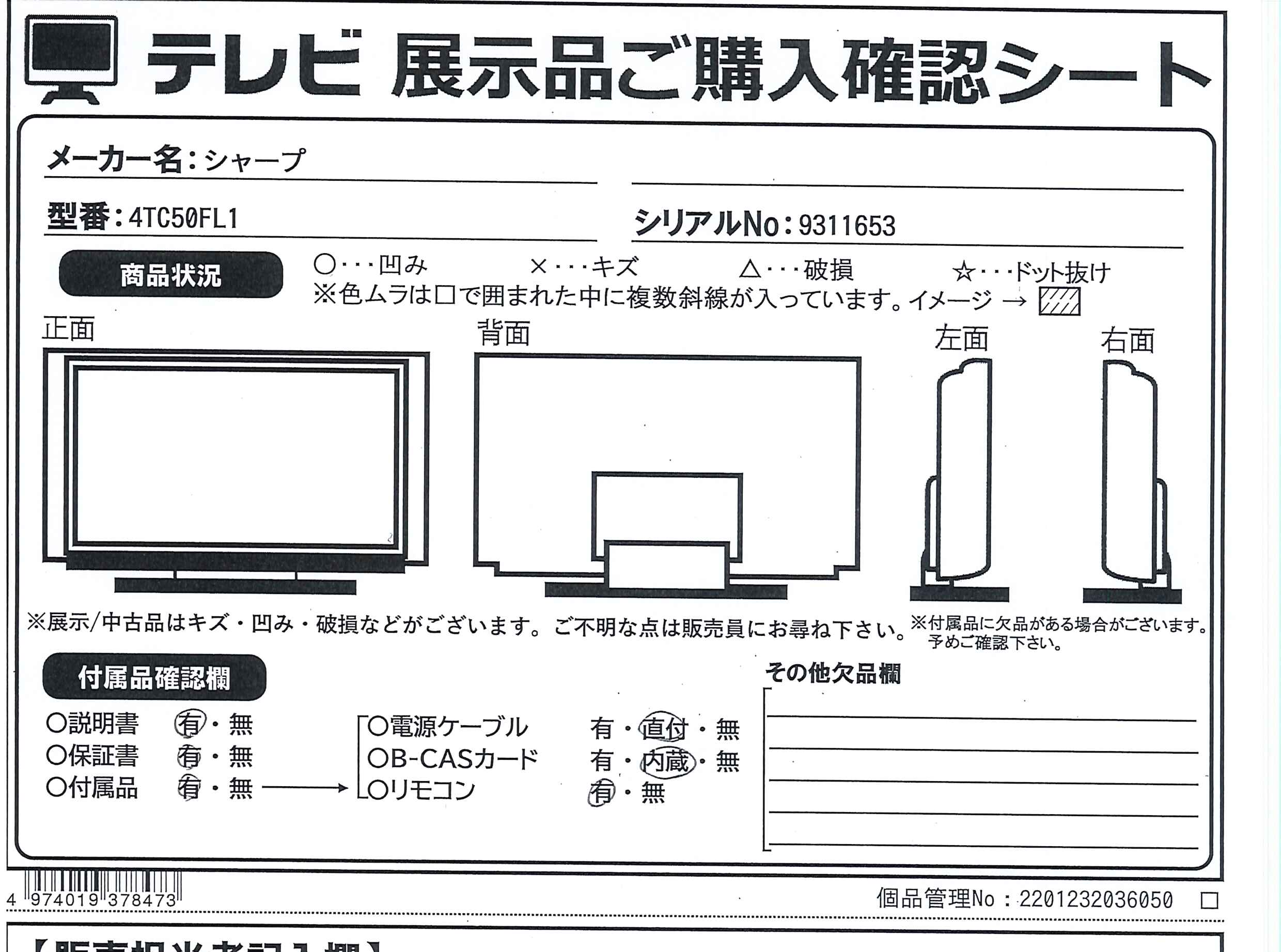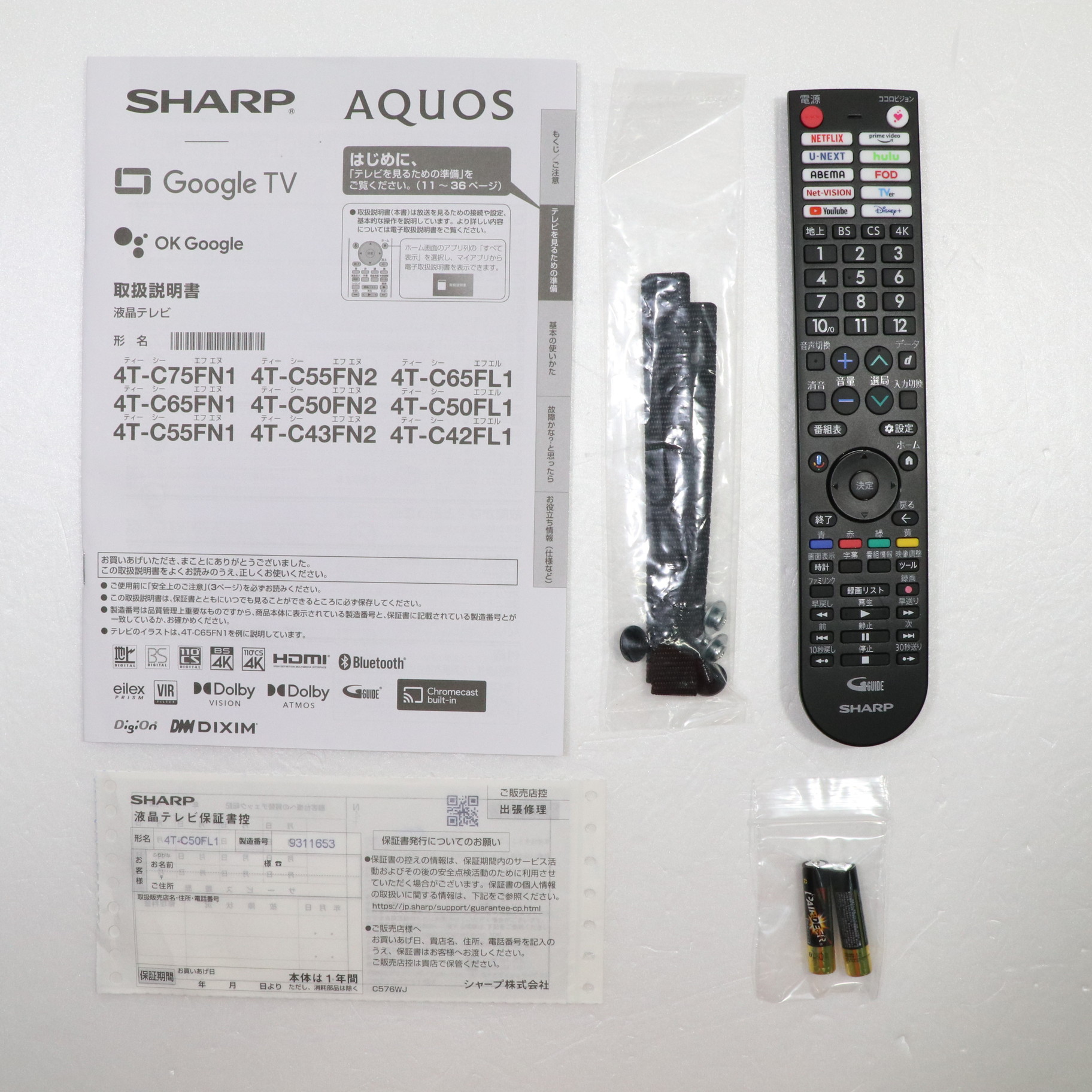 中古商品ランクについて 付属品・商品状態について 〔付属品〕取扱説明書、かんたん使い方ガイド、リモコン、単4形乾電池×2、スタンド(L)、スタンド(R)、スタンド取付用ネジ×4 M4(長さ 12mm)、転倒防止ベルト×2、転倒防止ベルトテレビ取付用ネジ(黒)×2 M4(長さ 16mm)、転倒防止ベルトテレビ台固定用ネジ(シルバー)×2 M4(長さ 16mm)