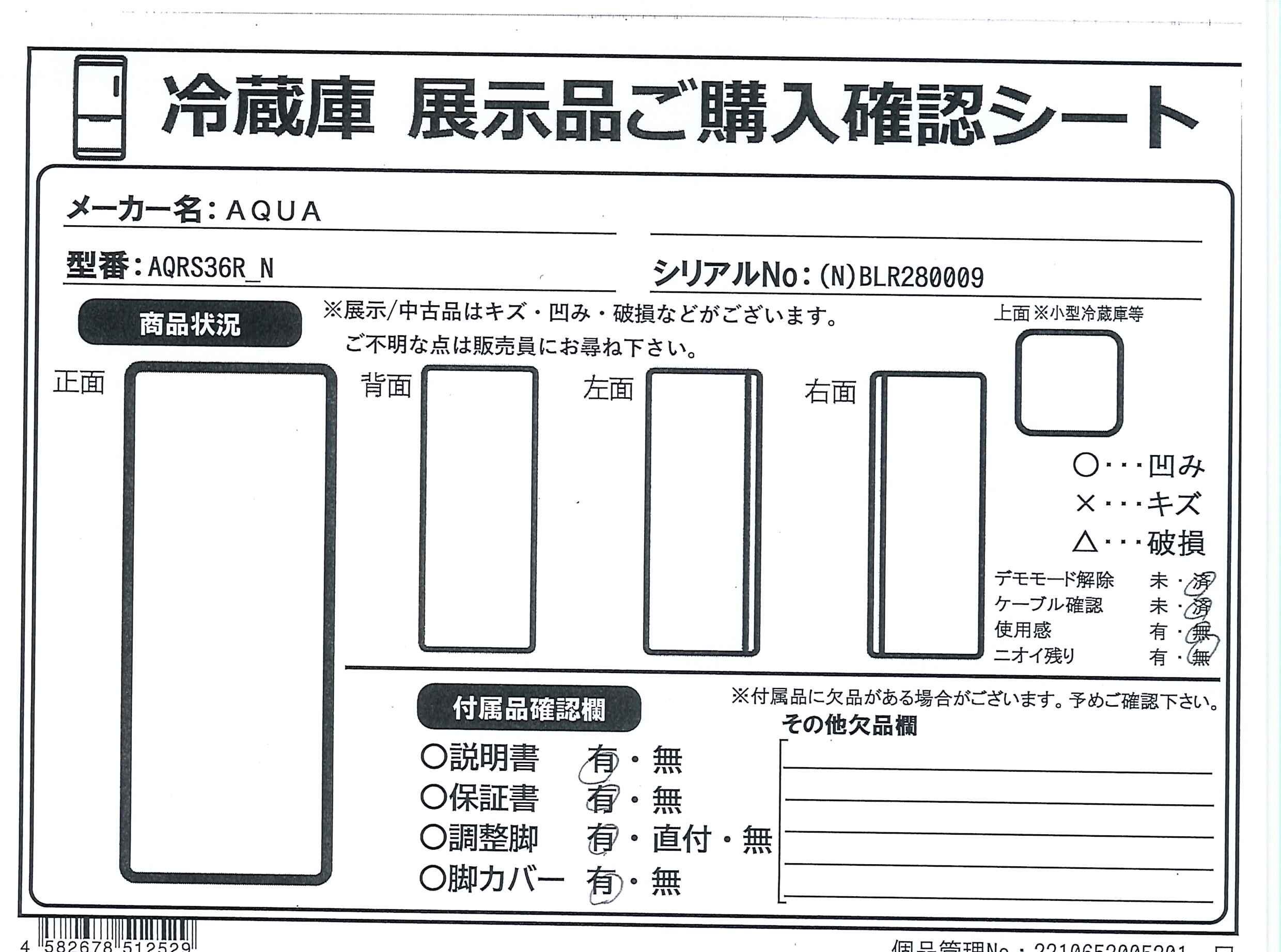中古商品ランクについて 付属品・商品状態について 〔付属品〕説明書、ガラス棚(ノーマル)、ガラス棚(ハーフ)×3、チルドケース、給水タンク、マルチポケット(小)、マルチポケット(大)、ワイドマルチポケット、卵皿&チューブスタンド、ミニボトルポケット、ボトル&ドレッシングポケット、冷凍ケース上下、製氷ユニット、アイストレイ、氷スコップ、野菜ケース、野菜ボックス、バスケット(野菜室)、おそうじ栓、キックプレート、調節脚×2