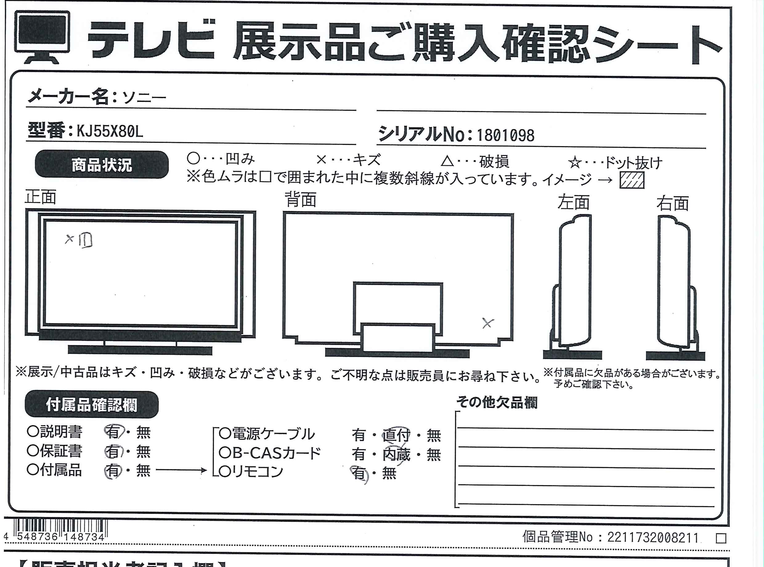 中古商品ランクについて 付属品・商品状態について 〔付属品〕取扱説明書、組み立て/設置ガイド、Google TV セットアップガイド、製品登録のおすすめ、リモコン、単4型乾電池×2、スペーサー(VS)×4、ケーブルカバー(CL)×2、スタンド(SB1)、スタンド(SB2)、転倒防止用ベルト一式(FB)