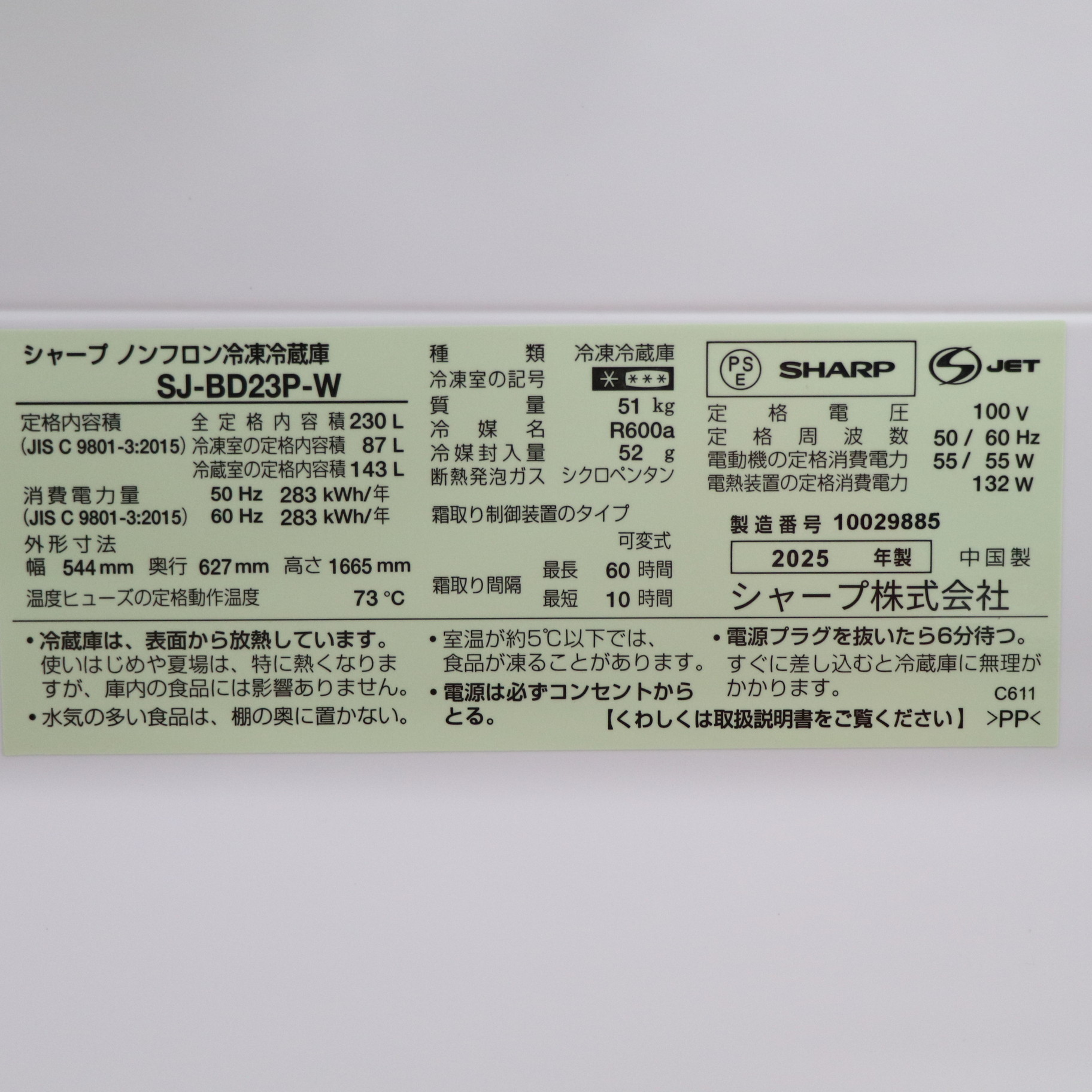 〔展示品〕 冷蔵庫 マットホワイト SJ-BD23P-W [幅54.4cm /230L /2ドア /右開きタイプ /2024年]