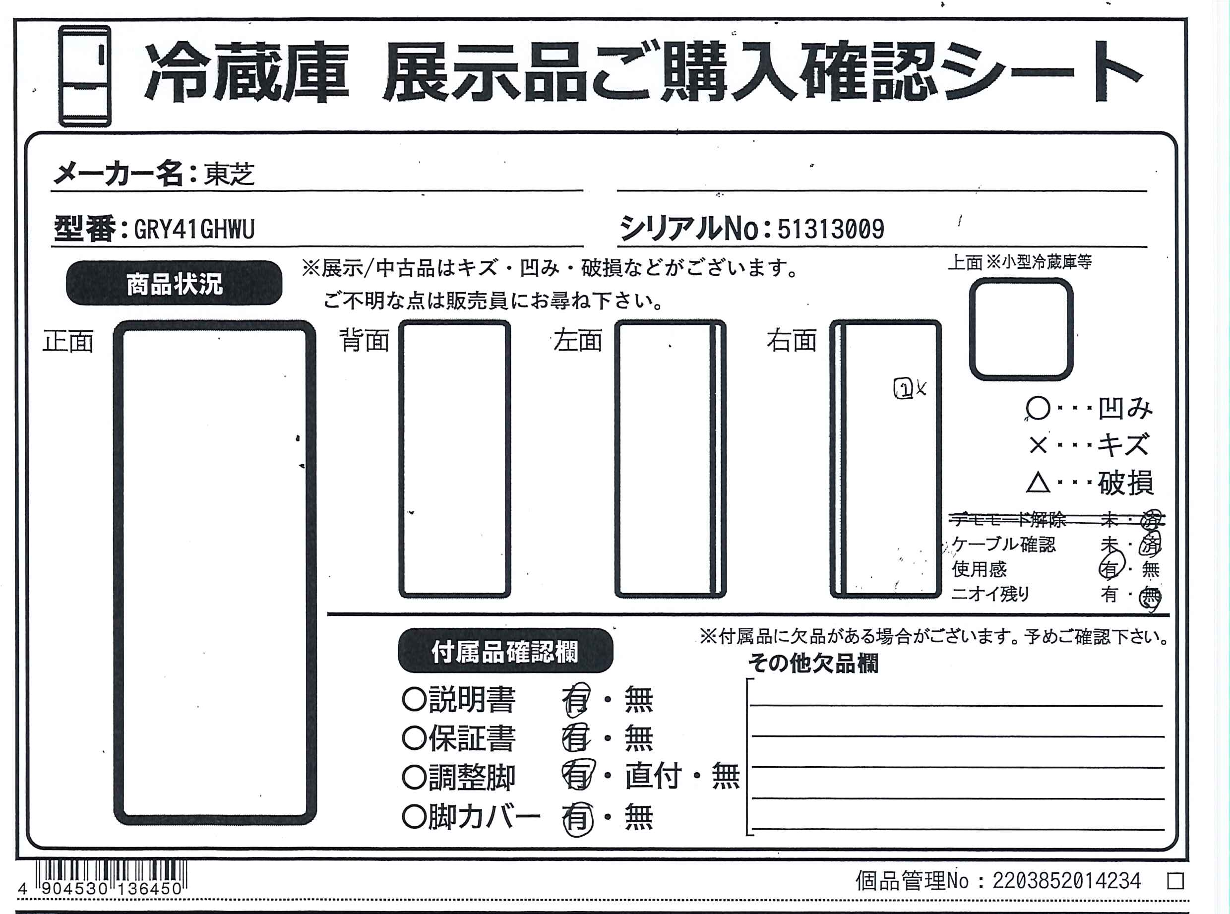 中古商品ランクについて 付属品・商品状態について 〔付属品〕説明書、調整脚×2、前面グリル、おそうじ口のフタ、アルミトレイ(冷凍室)、給水タンク、アイスシャベル、卵スタンド