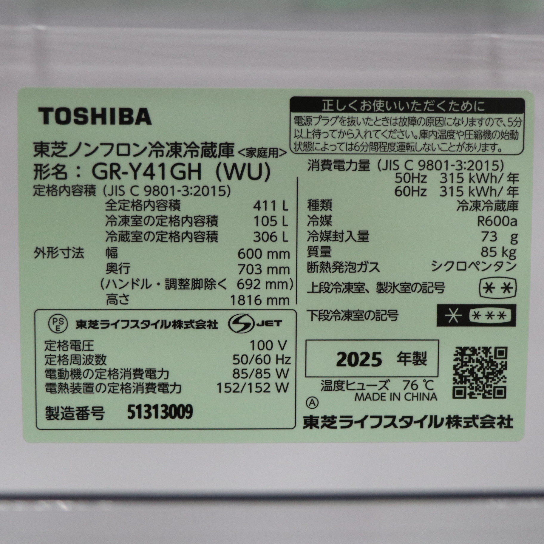 〔展示品〕 冷蔵庫 VEGETA(ベジータ)GHシリーズ マットホワイト GRY41GHWU [幅60cm /411L /5ドア /右開きタイプ /2025年]