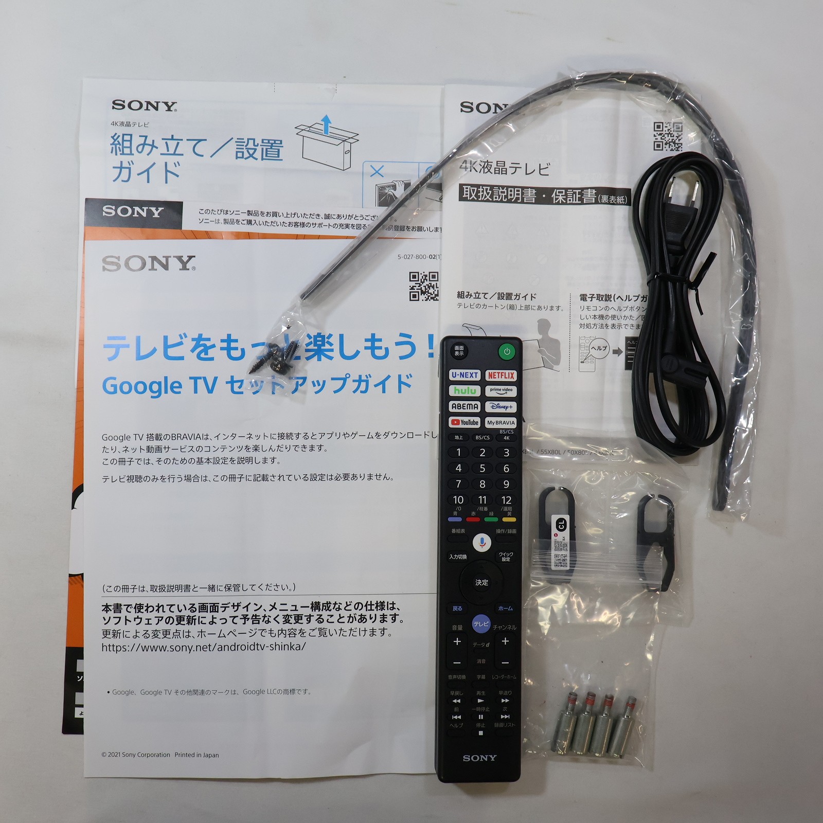 中古商品ランクについて 付属品・商品状態について 〔付属品〕説明書、組み立て/設置ガイド、Google TV セットアップガイド、製品登録のおすすめ、リモコン、スペーサー(VS)×4、ケーブルカバー(CL)×2、電源ケーブル、スタンド(SB1)、スタンド(SB2)、転倒防止用バンド一式(FB)
