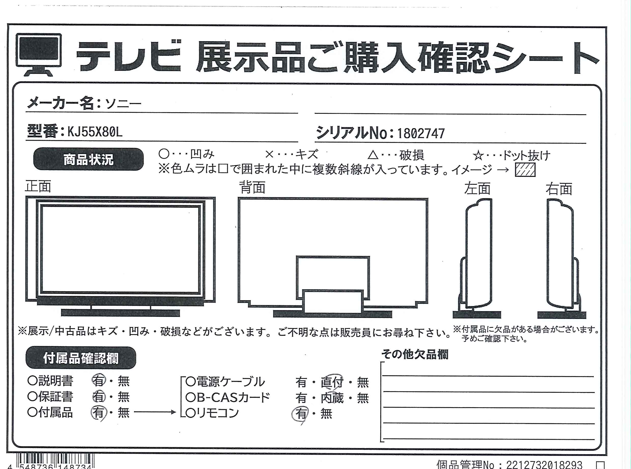 中古商品ランクについて 付属品・商品状態について 〔付属品〕取扱説明書、組み立て/設置ガイド、Google TV セットアップガイド、製品登録のおすすめ、リモコン、単4型乾電池×2、スペーサー(VS)×4、ケーブルカバー(CL)×2、スタンド(SB1)、スタンド(SB2)、転倒防止用ベルト一式(FB)