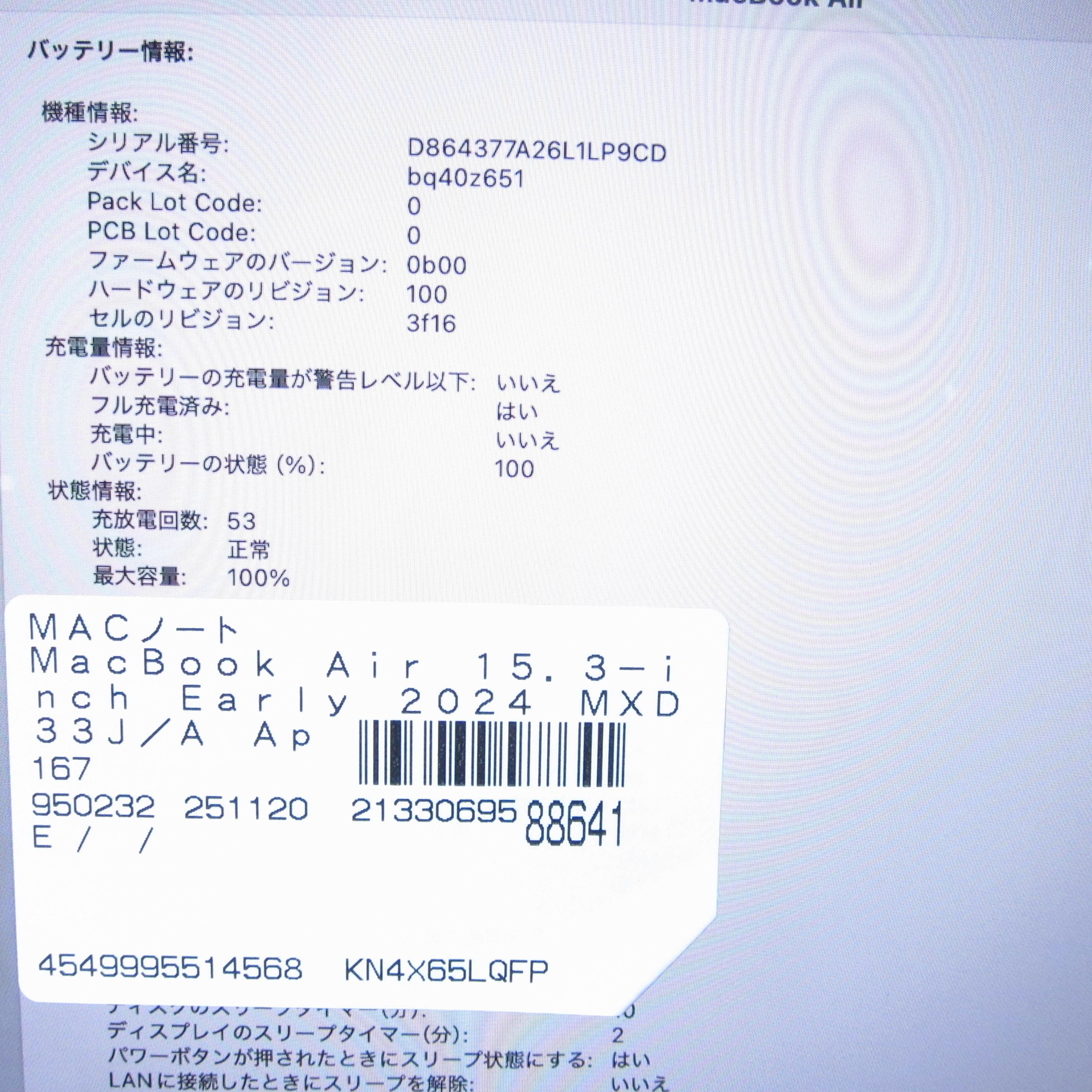〔中古品〕 MacBook Air 15.3-inch Early-2024 MXD33J/A Apple M3 8コアCPU_10コアGPU 16GB SSD1TB スターライト 〔15.3 Sequoia〕 [グラフィック:オンボード/JISキーボード]