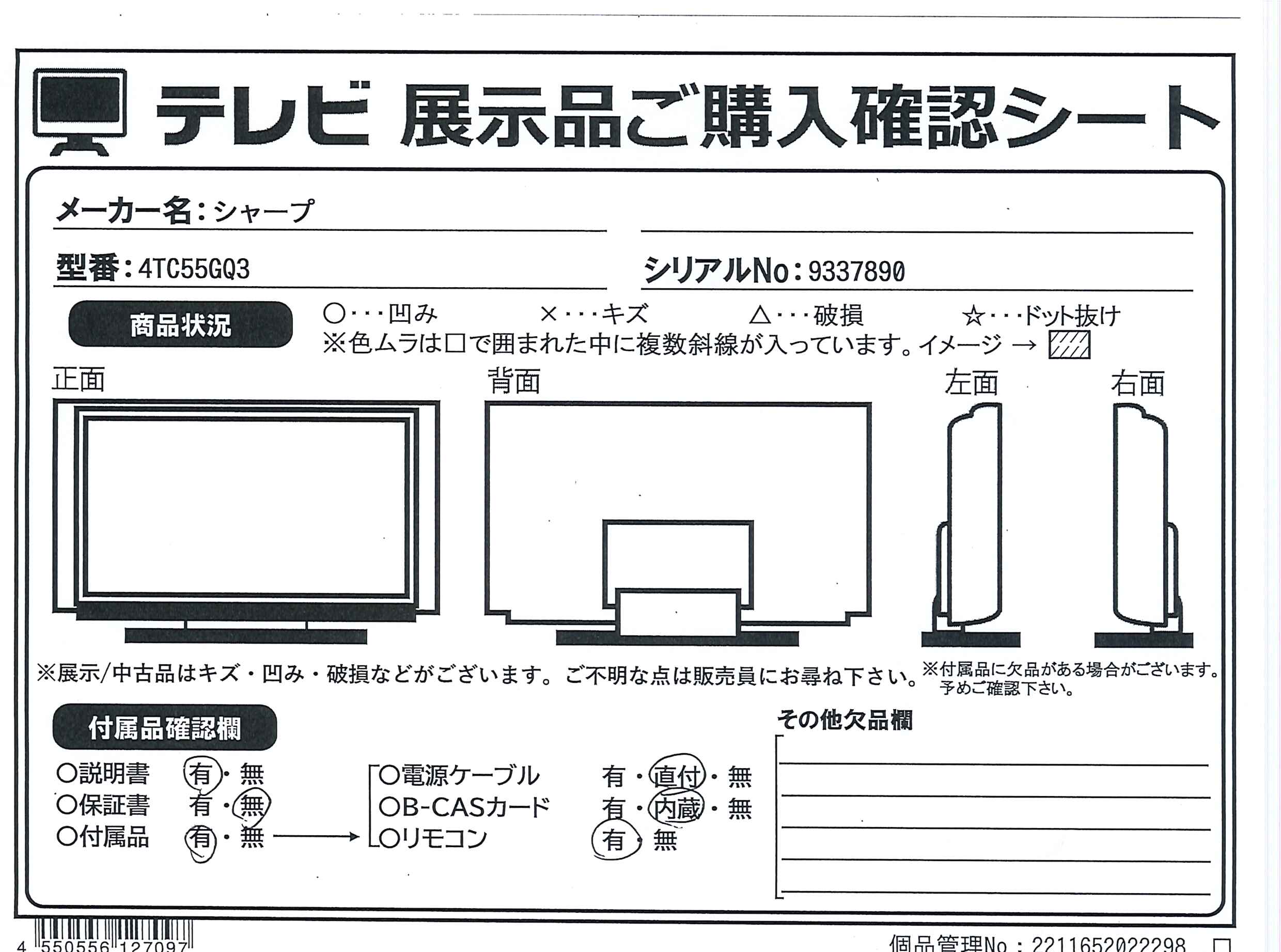 ▼同型番の新品商品はこちら![]() SHARP(シャープ) 有機ELテレビ AQUOS 4T-C55GQ3 [55V型 /Bluetooth対応 /4K対応 /BS・CS 4Kチューナー内蔵 /YouTube対応] ¥176,000(税込) 17,600ポイントサービス 在庫限り |
