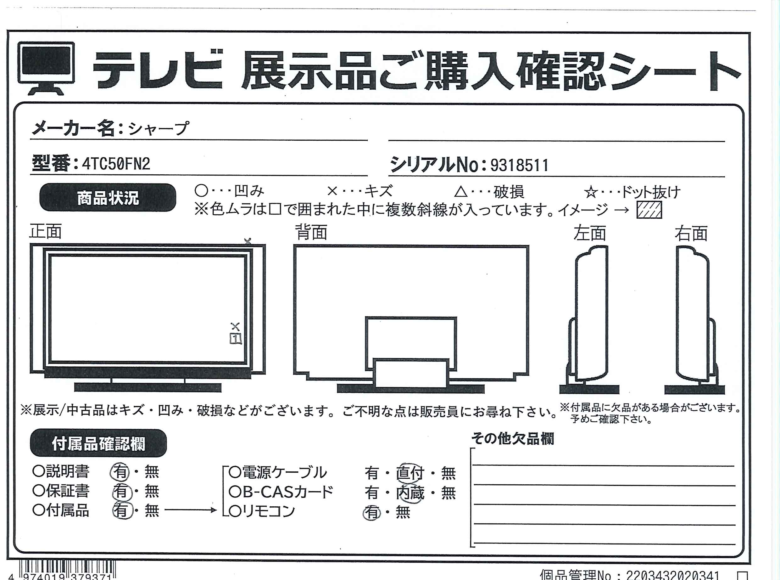 中古商品ランクについて 付属品・商品状態について 〔付属品〕説明書、かんたん使い方ガイド、リモコン、リモコン用単4形乾電池×2、スタンドベース、スタンド取付金具、スタンドカバー、スタンド組立用ネジ×4、スタンド取付用ネジ×4、スタンドカバー取付用ネジ、転倒防止ベルト、転倒防止ベルトテレビ取り付け用ネジ、転倒防止ベルトテレビ台固定用ネジ、スタンド回転ロックネジ