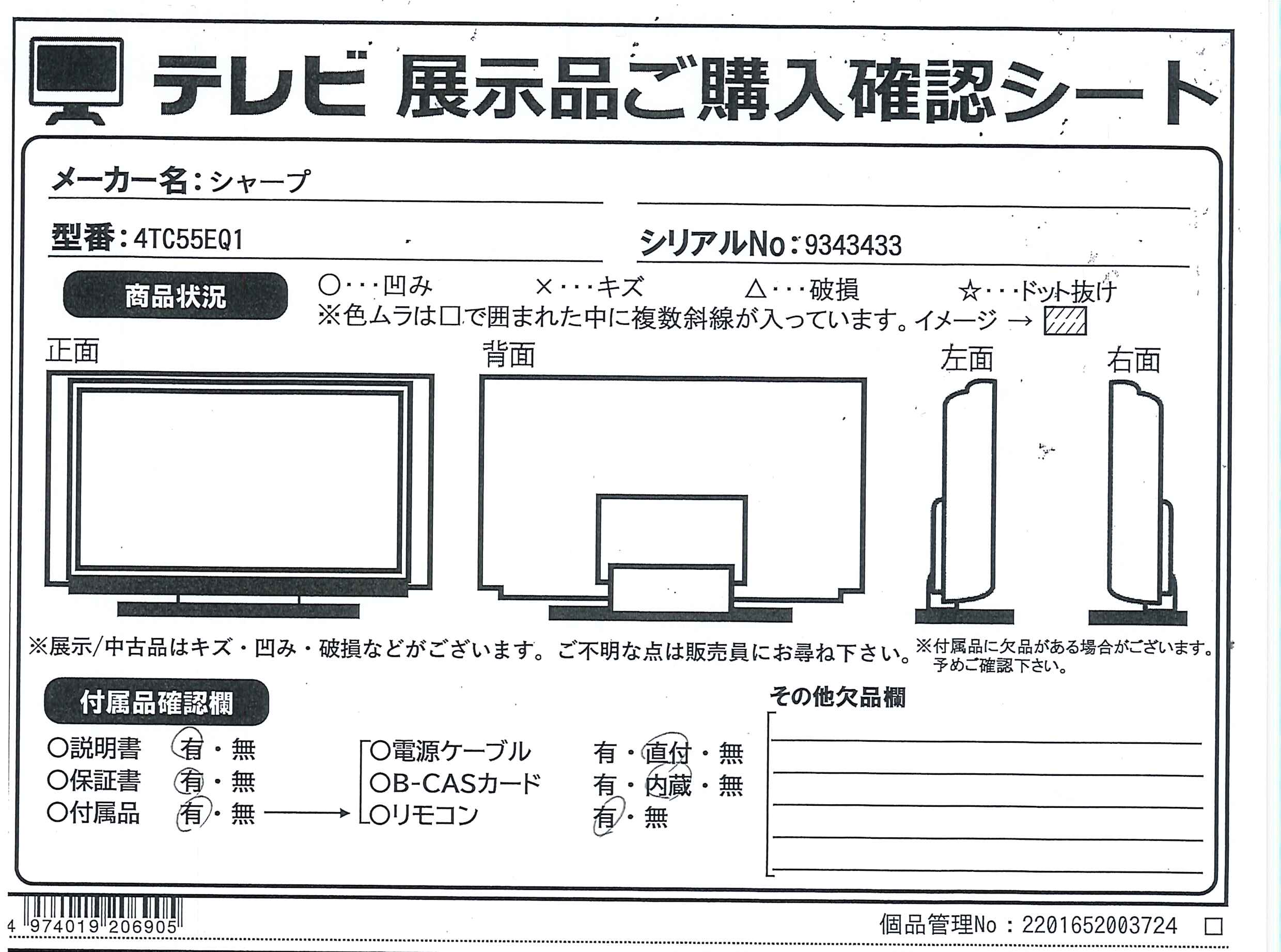 中古商品ランクについて 付属品・商品状態について 〔付属品〕説明書、かんたん使い方ガイド、リモコン× 1、リモコン用単4形 乾電池× 2、スタンド取付金具× 1、スタンドカバー× 1、スタンドベース× 1、スタンド組立用ネジ×4 M5 (長さ 14.5mm (大))、スタンド取付用ネジ×4 M5 (長さ 14.5mm (大))、転倒防止ベルト×1、転倒防止ベルトテレビ取り付け用 ネジ(黒)×1 M4(長さ 8mm)、転倒防止ベルトテレビ台固定用 ネジ ( シルバー)×1 M4(長さ 16mm)