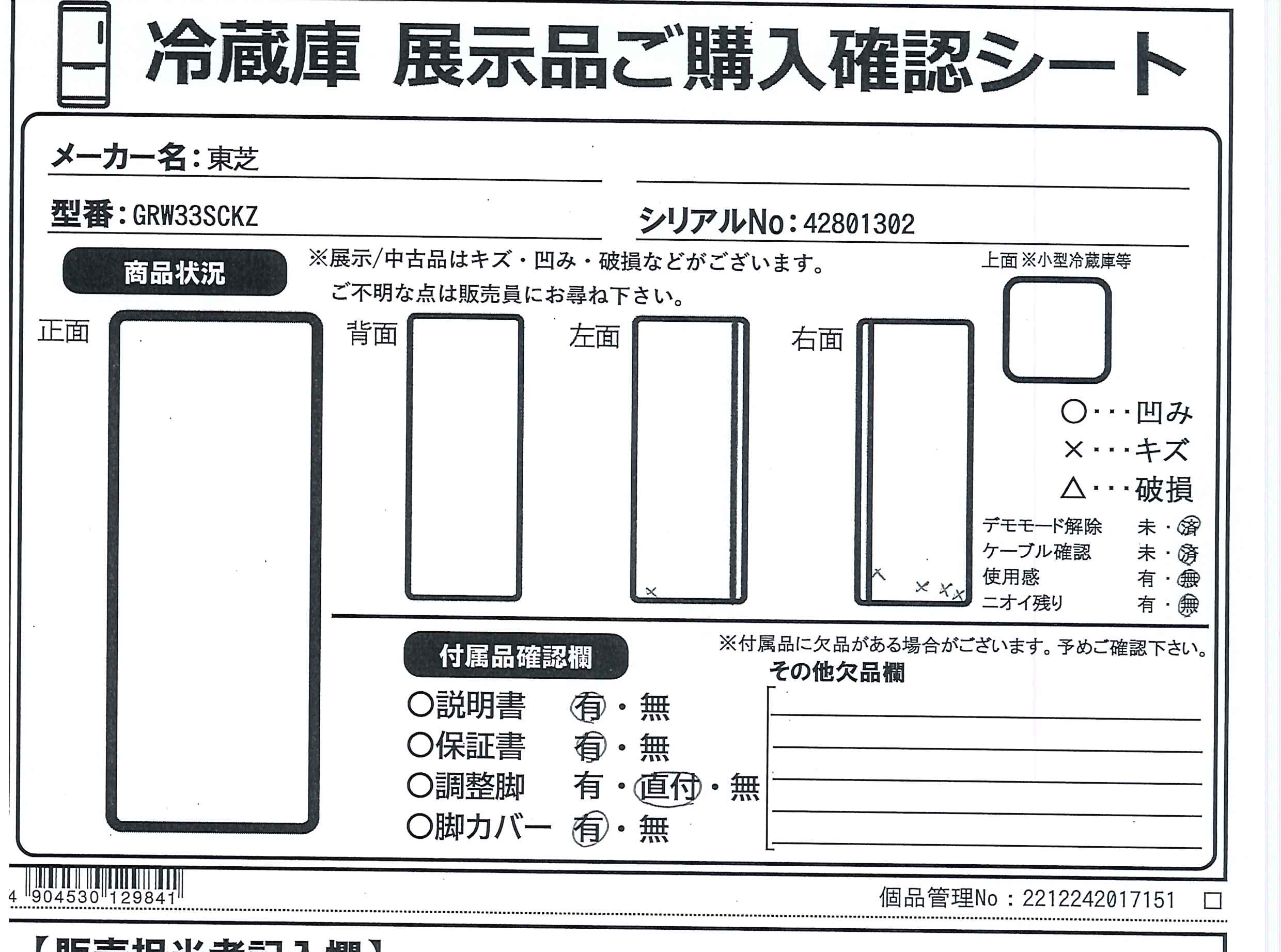 中古商品ランクについて 付属品・商品状態について 〔付属品〕説明書、調整脚×2、前面グリル、仕切れるチューブスタンド、卵スタンド、おそうじ口のフタ、給水タンク、アイスシャベル