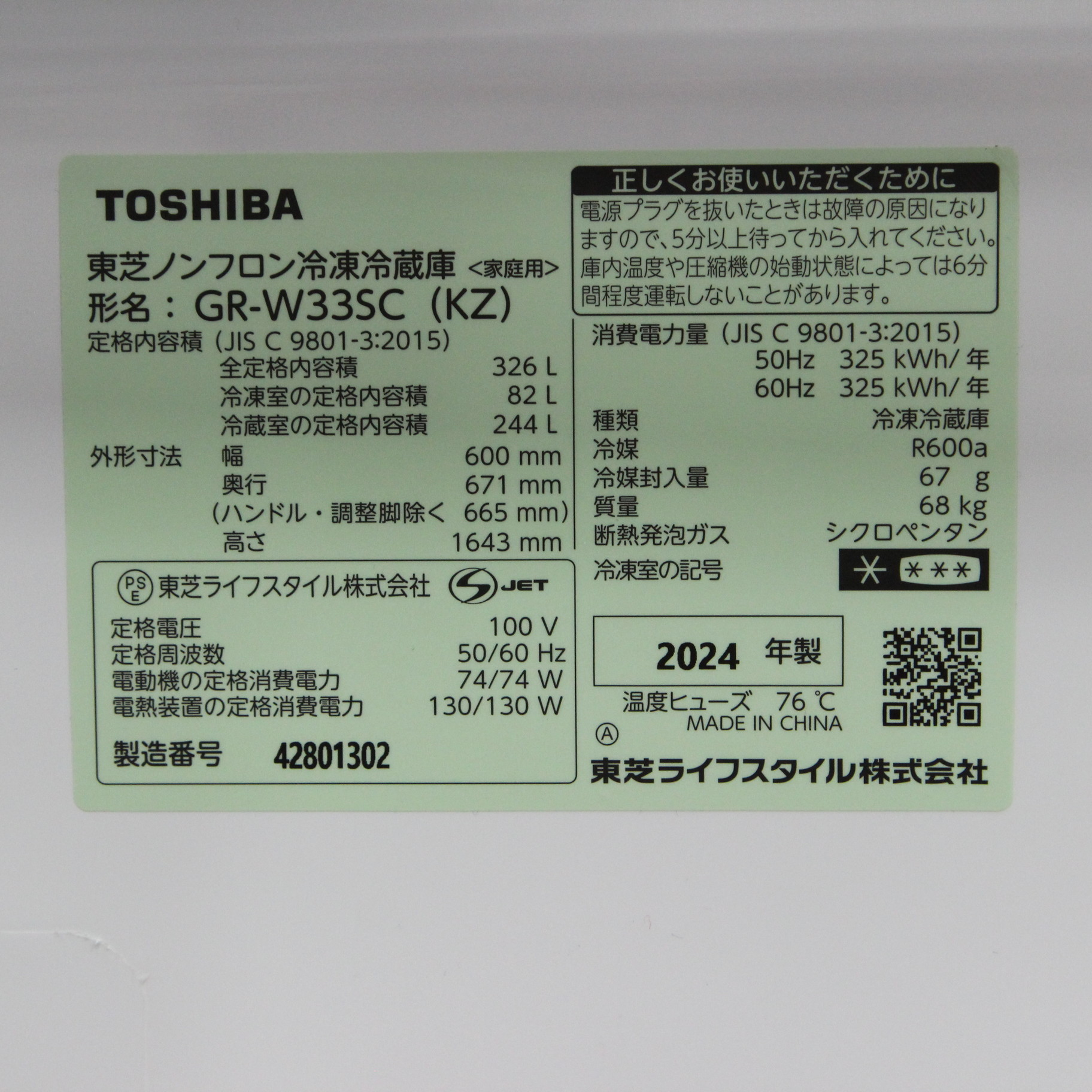 〔展示品〕 冷蔵庫 VEGETA(ベジータ)SCシリーズ マットチャコール GR-W33SC-KZ [幅60cm /326L /3ドア /右開きタイプ /2024年]
