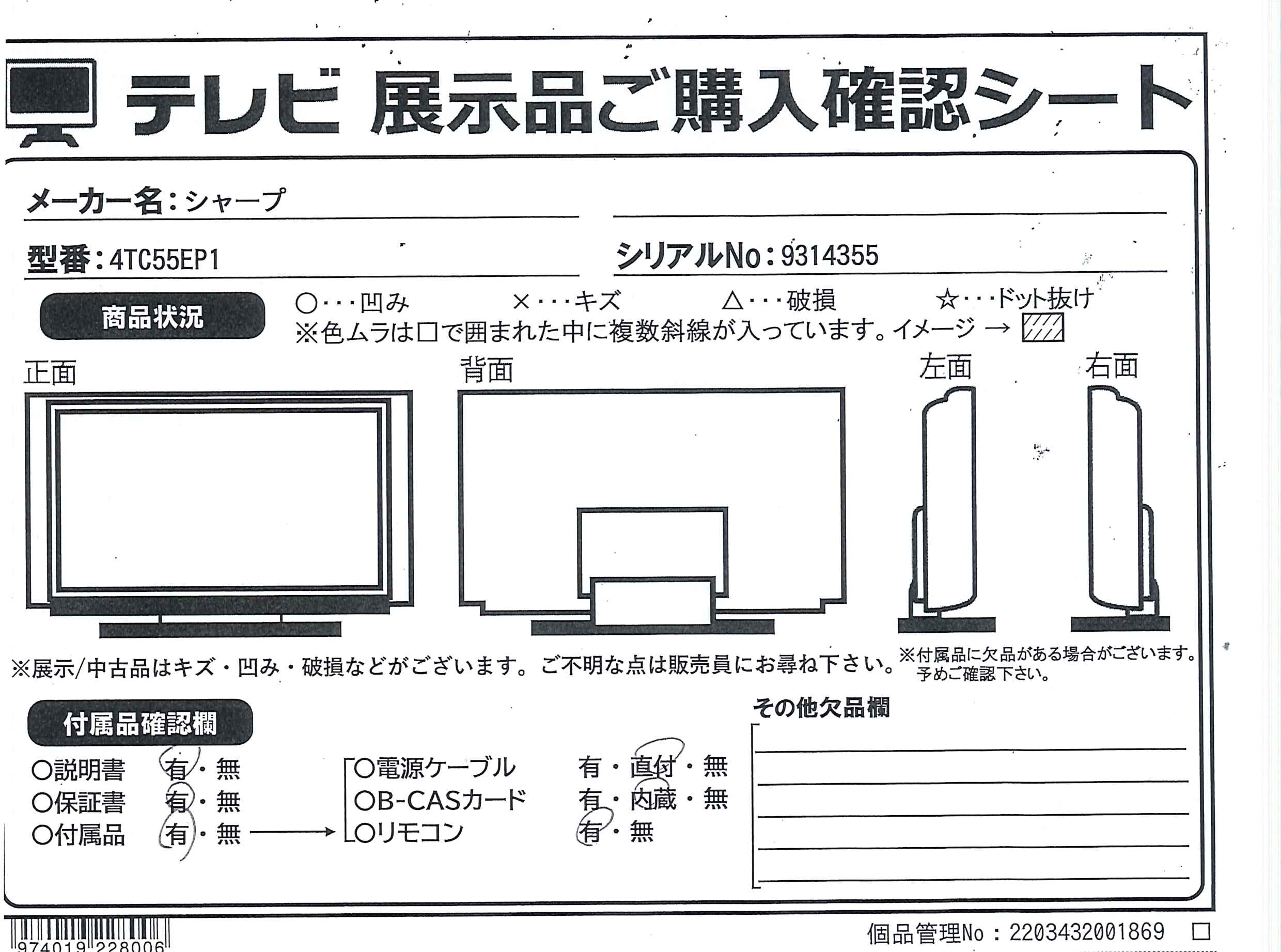 中古商品ランクについて 付属品・商品状態について 〔付属品〕取扱説明書、リモコン、リモコン用単四形乾電池×2、スタンド取付金具、スタンドカバー、スタンドベース、スタンド組立用ネジ×4、スタンド取付用ネジ×4、転倒防止ベルト一式、スタンド回転ロックネジ、かんたんガイド