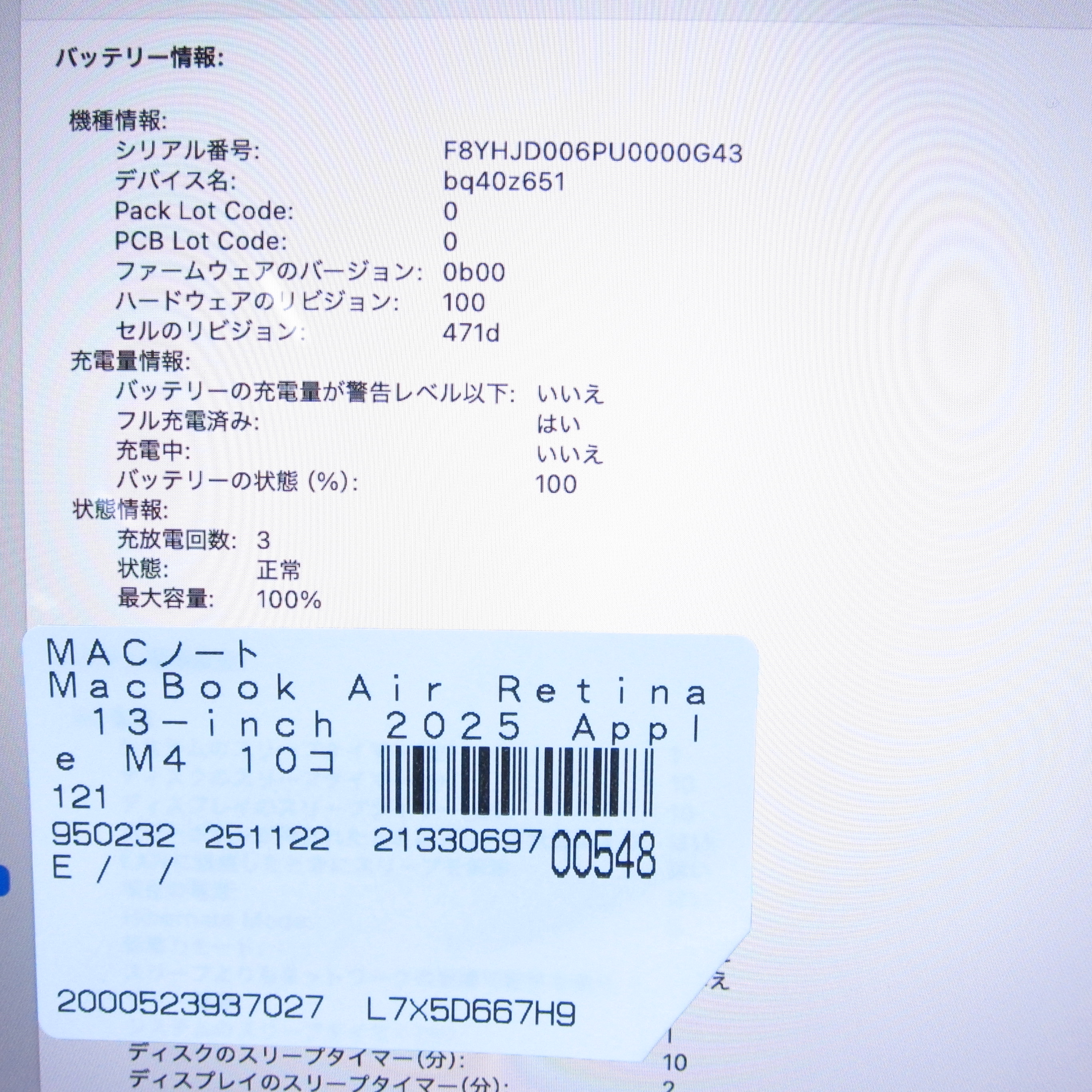 〔中古品〕 MacBook Air 13.6-inch Early-2025 MW123J/A Apple M4 10コアCPU_10コアGPU 24GB SSD256GB ミッドナイト 〔15.7 Sequoia〕 [グラフィック:オンボード/USキーボード]