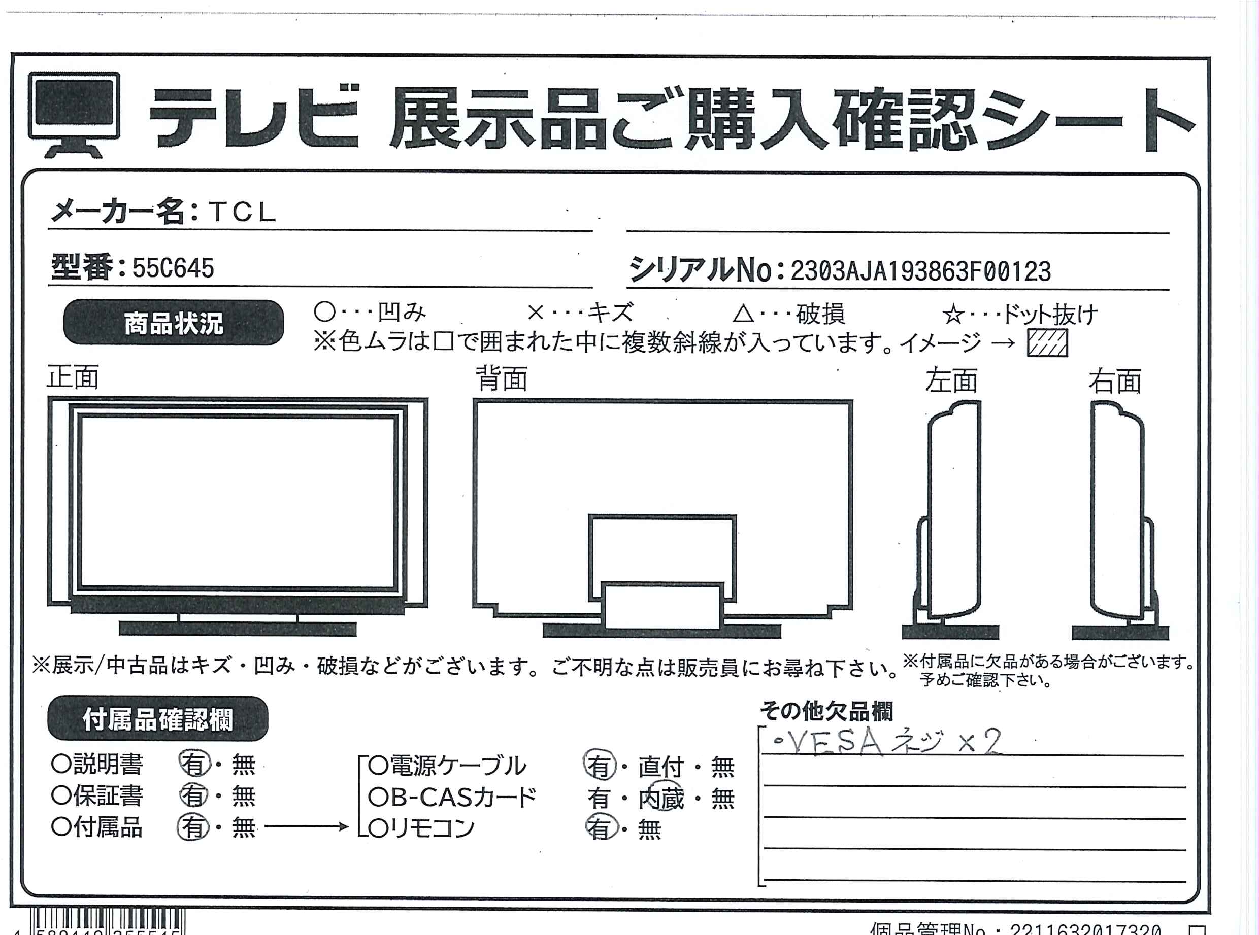 中古商品ランクについて 付属品・商品状態について 〔付属品〕説明書、かんたんガイド、リモコン、単四形乾電池×2、電源コード、スタンド×2、スタンド用ネジ×4、ケーブルクランプ×2、転倒落下防止用ネジ、クリップ×3