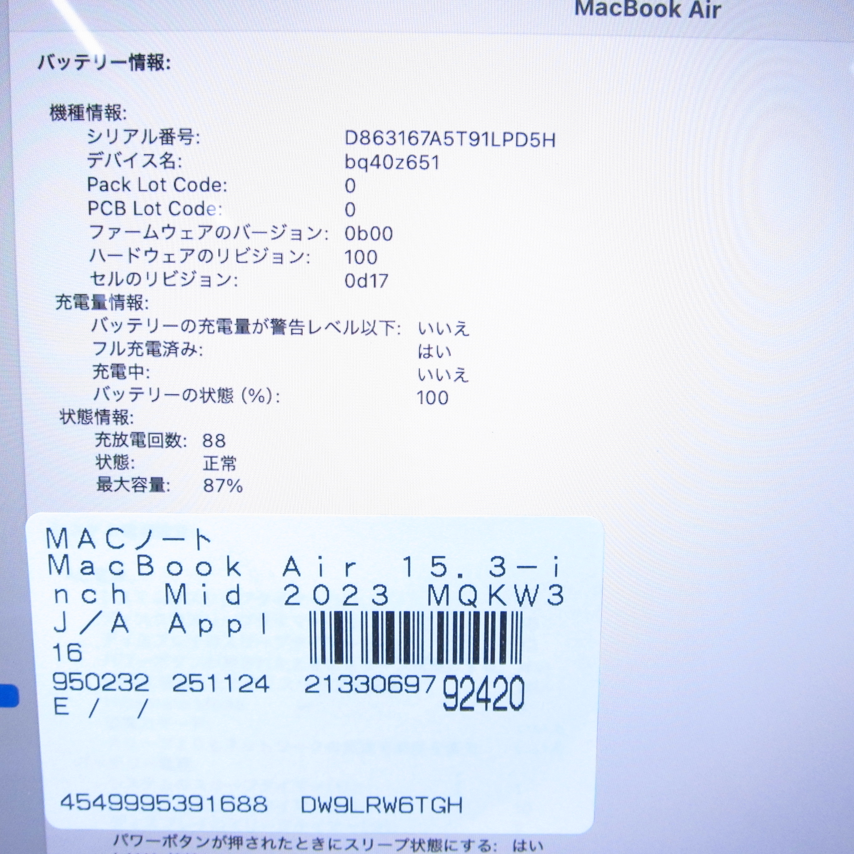 〔中古品〕 MacBook Air 15.3-inch Mid-2023 MQKW3J/A Apple M2 8コアCPU_10コアGPU 8GB SSD256GB ミッドナイト 〔15.3 Sequoia〕 [グラフィック:オンボード/JISキーボード]
