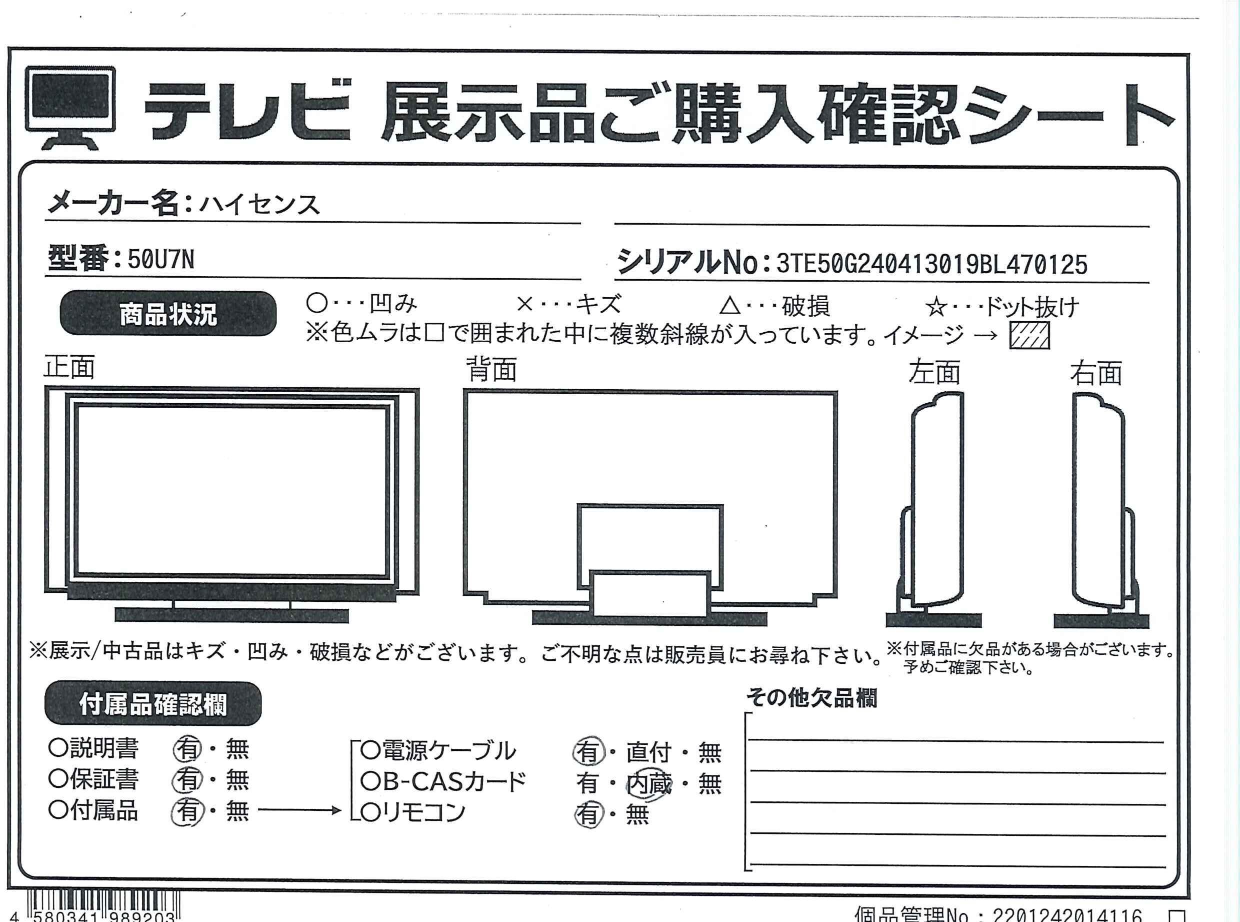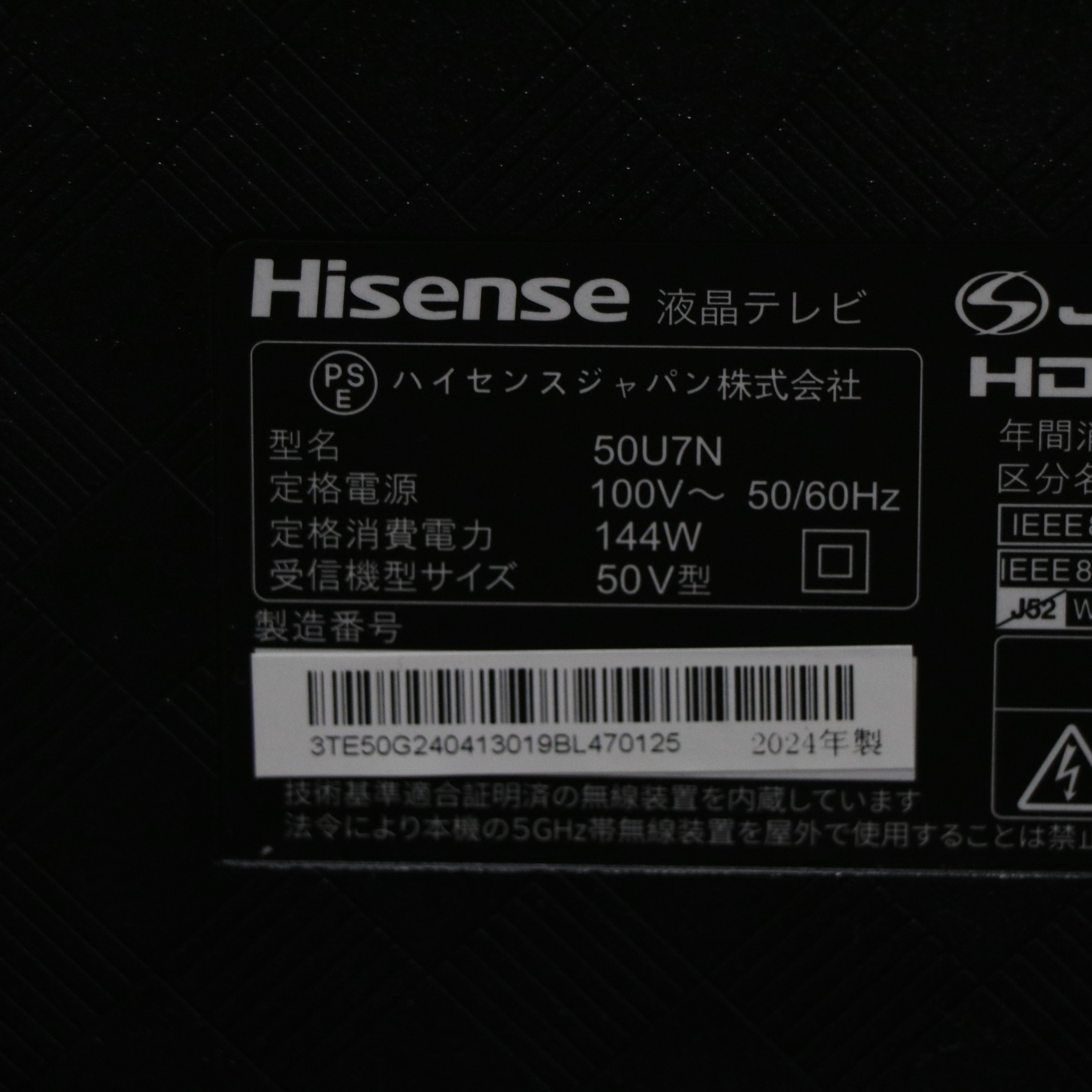 〔展示品〕 液晶テレビ 50U7N [50V型 /Bluetooth対応 /4K対応 /BS・CS 4Kチューナー内蔵 /YouTube対応]