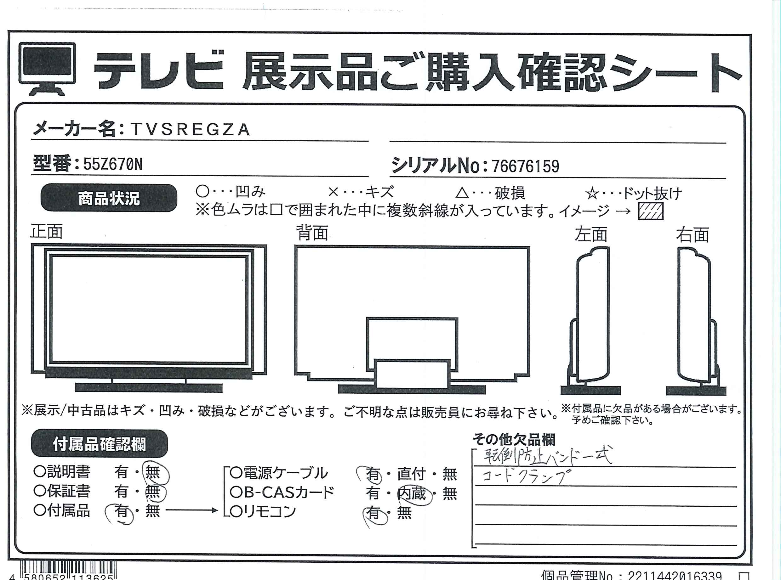 中古商品ランクについて 付属品・商品状態について 〔付属品〕リモコン、リモコン用単4形乾電池×2、電源コード、スタンドベース、スタンド支柱、スタンド組立・取付ネジ×8本、スタンドカバー